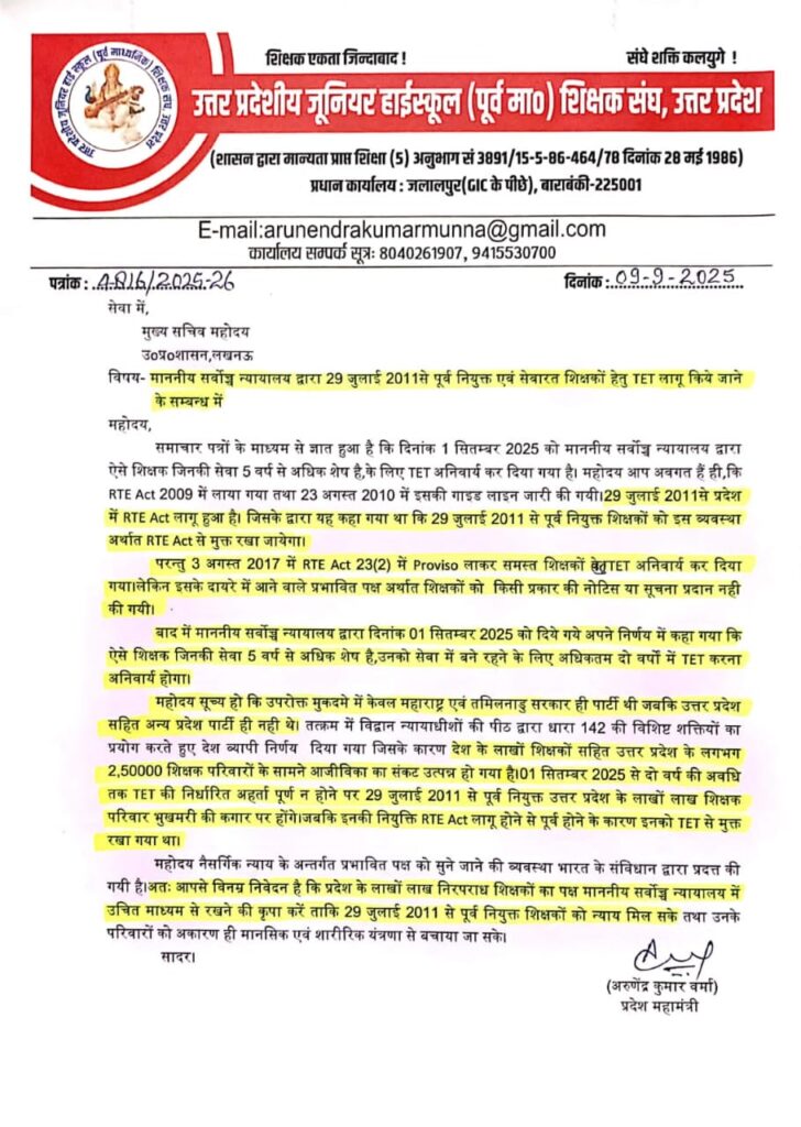 समाचार पत्रों के माध्यम से ज्ञात हुआ है कि दिनांक 1 सितम्बर 2025 को माननीय सर्वोच्च न्यायालय द्वारा ऐसे शिक्षक जिनकी सेवा 5 वर्ष से अधिक शेप है, के लिए TET अनिवार्य कर दिया गया है। महोदय आप अवगत हैं ही, कि RTE Act 2009 में लाया गया तथा 23 अगस्त 2010 में इसकी गाइड लाइन जारी की गयी। 29 जुलाई 2011 से प्रदेश में RTE Act लागू हुआ है। जिसके द्वारा यह कहा गया था कि 29 जुलाई 2011 से पूर्व नियुक्त शिक्षकों को इस व्यवस्था अर्थात RTE Act से मुक्त रखा जायेगा।