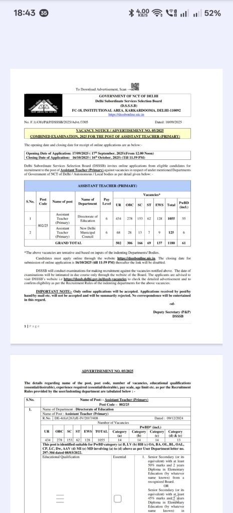 DSSSB PRT का विज्ञापन हुआ जारी