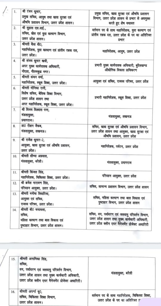 दीपक कुमार को अपर मुख्य सचिव, बेसिक एवं माध्यमिक शिक्षा विभाग के पद से अवमुक्त कर उन्हें अवस्थापना एवं औद्योगिक विकास आयुक्त, अध्यक्ष, पिकप, मुख्य कार्यपालक अधिकारी, यूपीडा, अपर मुख्य सचिव, नागरिक उड्डयन एवं समन्वय विभाग, उत्तर प्रदेश शासन तथा परियोजना निदेशक, यूपीडास्प के पद का अतिरिक्त प्रभार दिया गया है। पार्थसारथी सेन शर्मा को प्रमुख सचिव, चिकित्सा, स्वास्थ्य एवं परिवार कल्याण तथा चिकित्सा शिक्षा विभाग के साथ अब वह प्रमुख सचिव, बेसिक शिक्षा एवं माध्यमिक शिक्षा विभाग भी रहेंगे।