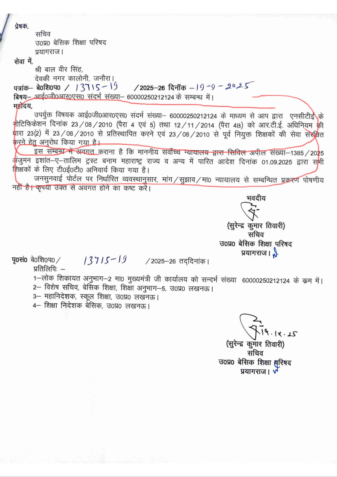 स्पष्ट है कि किसी शिक्षक संघ का ज्ञापन डालकर इस विषय में किसी ने शिकायत की थी, जिस पर सचिव, बेसिक शिक्षा परिषद ने साफ़ शब्दों में जवाब दिया है कि सर्वोच्च न्यायालय के आदेशनुसार सभी शिक्षकों के लिए TET अनिवार्य होगा। कुछ लोग बता रहे थे उत्तर प्रदेश प्रभावित नही है। सचिव बेसिक शिक्षा परिषद ने इसकी पुष्टि कर दी।