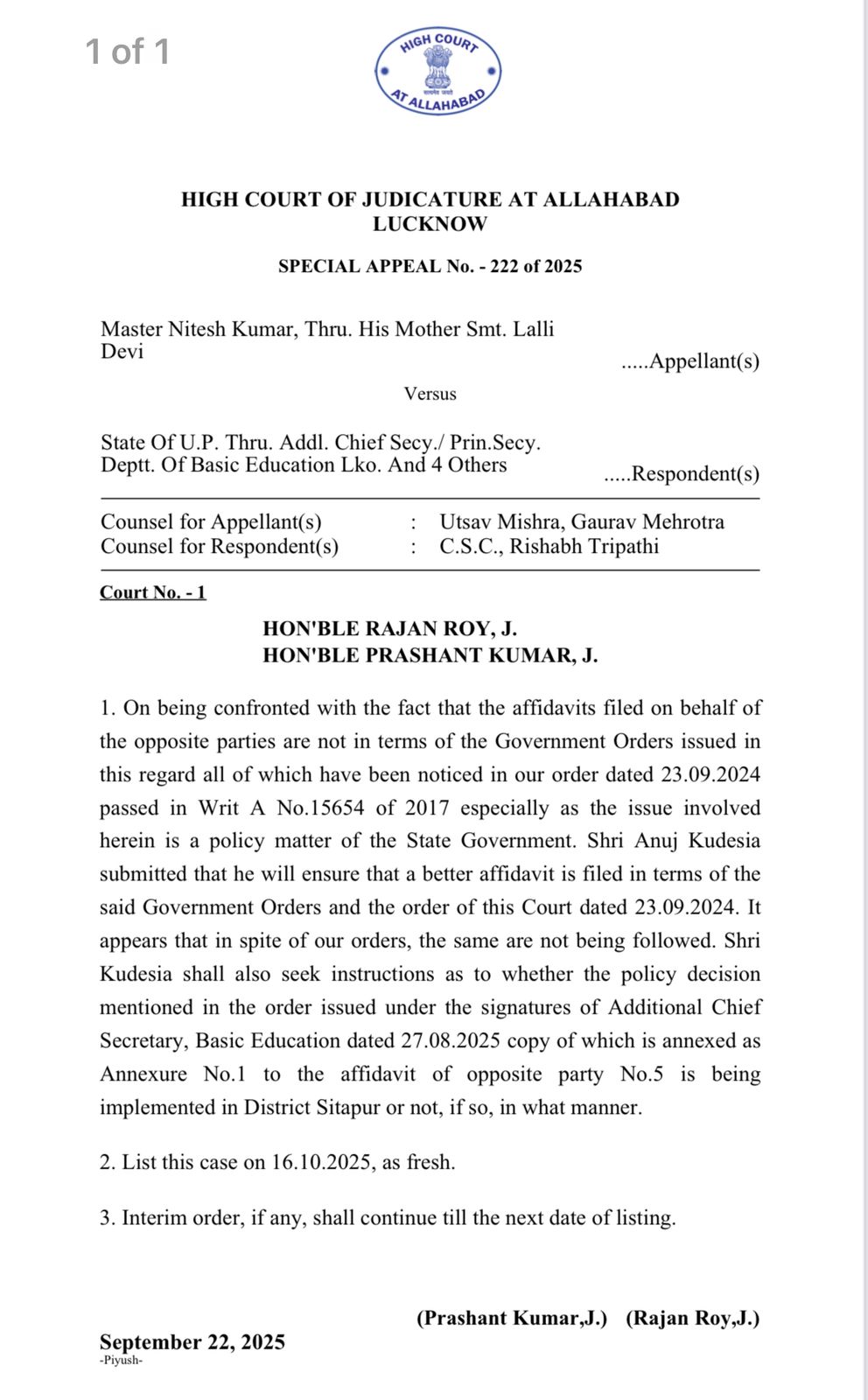 मैं शुरू से कह रहा था सरकार के affidavit में झोल है उसी को लेकर मर्जर पर मुख्य याचिका Special Appeal No. 222 of 2025 (Master Nitesh Kumar vs State of U.P. & Others), दिनांक 22 सितंबर 2025 का आदेश
