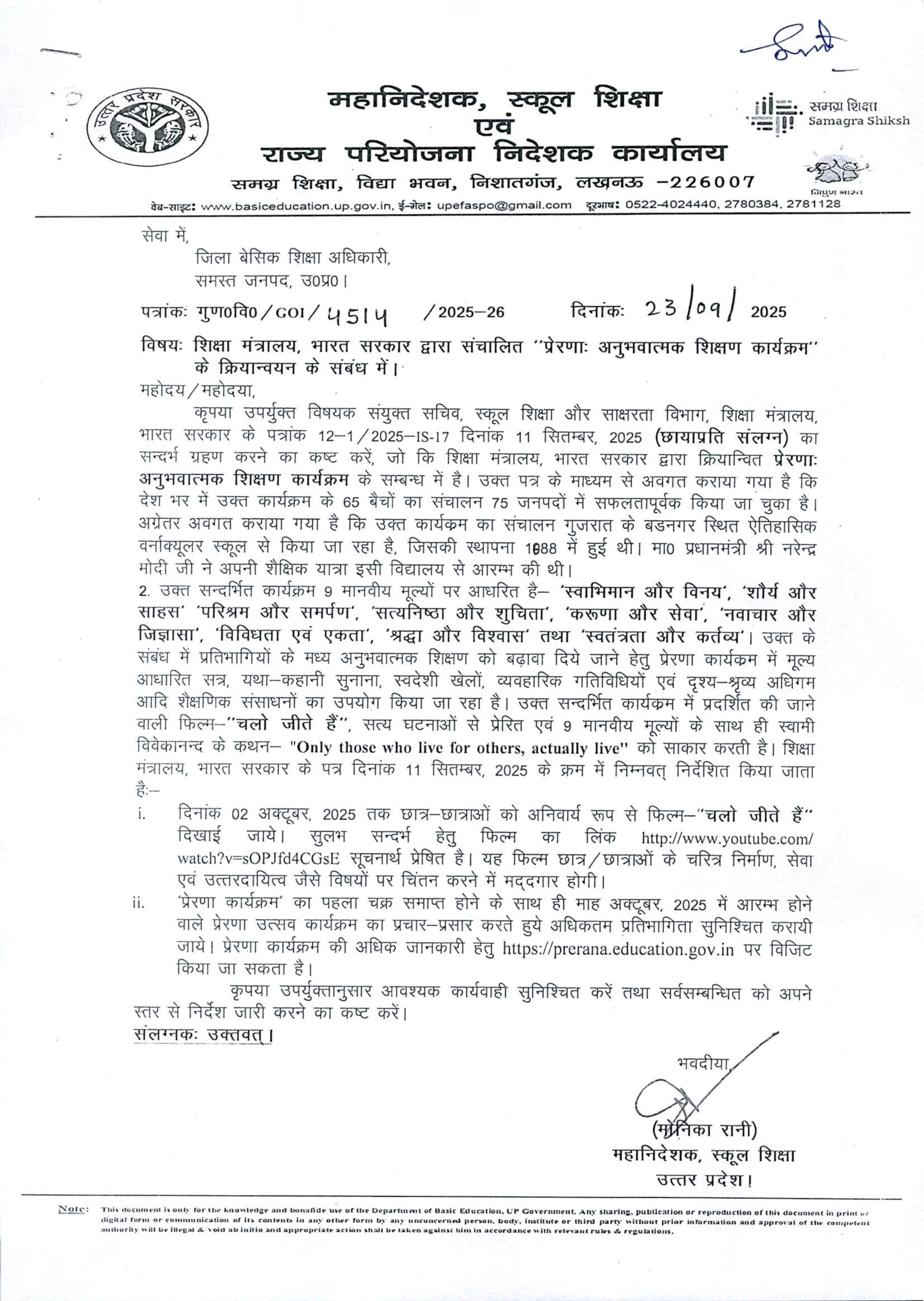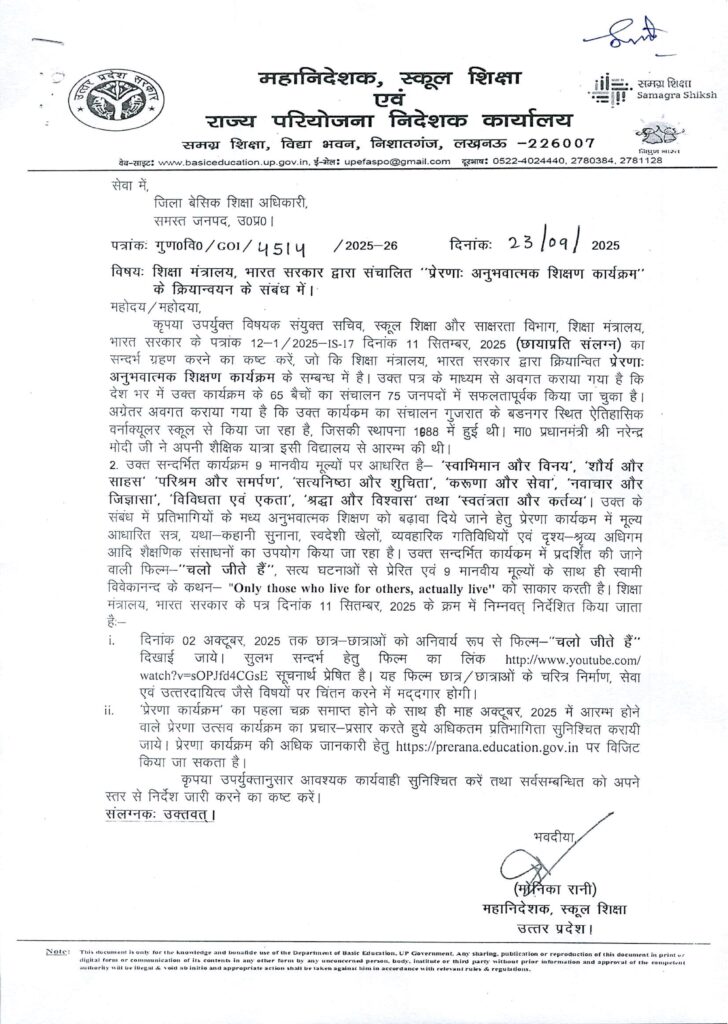 शिक्षा मंत्रालय, भारत सरकार द्वारा संचालित “प्रेरणा अनुभवात्मक शिक्षण कार्यक्रम” के क्रियान्वयन के संबंध में।