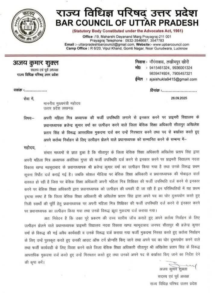 अपनी महिला मित्र अध्यापक की फर्जी उपस्थिति लगाने से इनकार करने पर प्राइमरी विद्यालय के प्रधानाध्यापक ब्रजेन्द्र कुमार वर्मा का उत्पीड़न करने वाले जिला बेसिक शिक्षा अधिकारी सीतापुर अखिलेश प्रताप सिंह के विरुद्ध आपराधिक मुकदमा दर्ज कर उन्हें गिरफ्तार करने तथा पद से बर्खास्त करते हुए अपने कर्तव्य निर्वाहन के लिए उत्पीड़न झेलने वाले प्रधानाध्यपक को सम्मानित करने के सम्बन्ध में