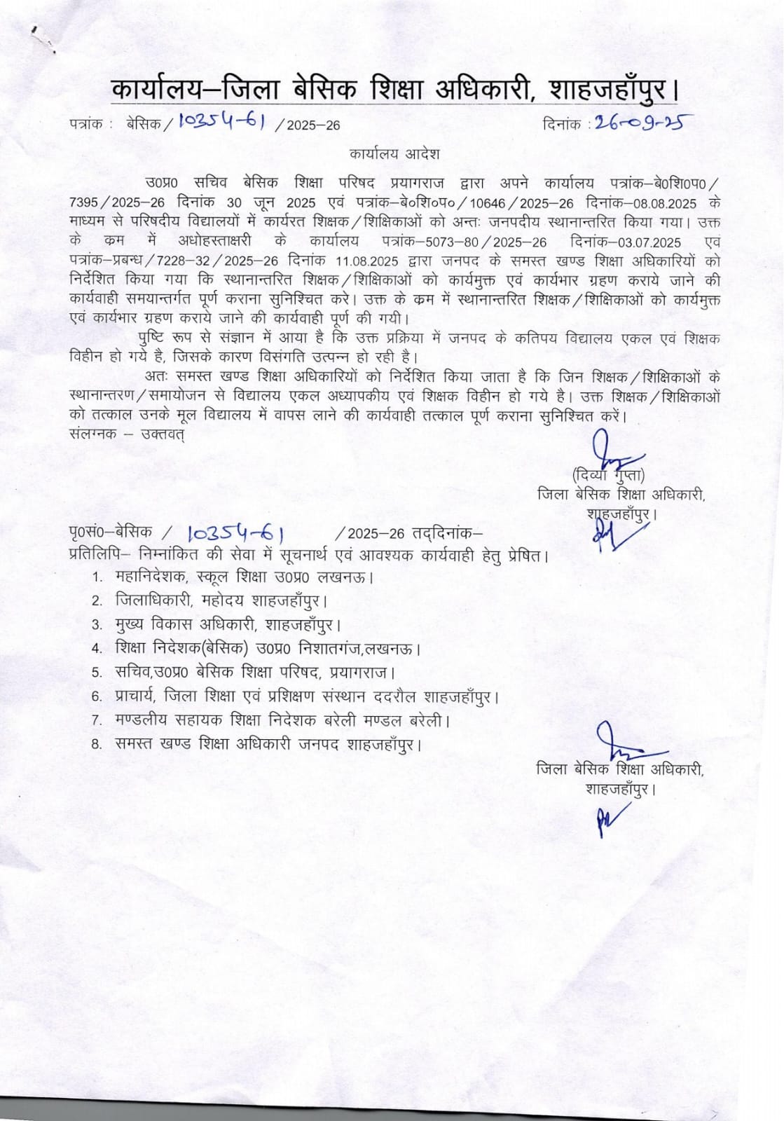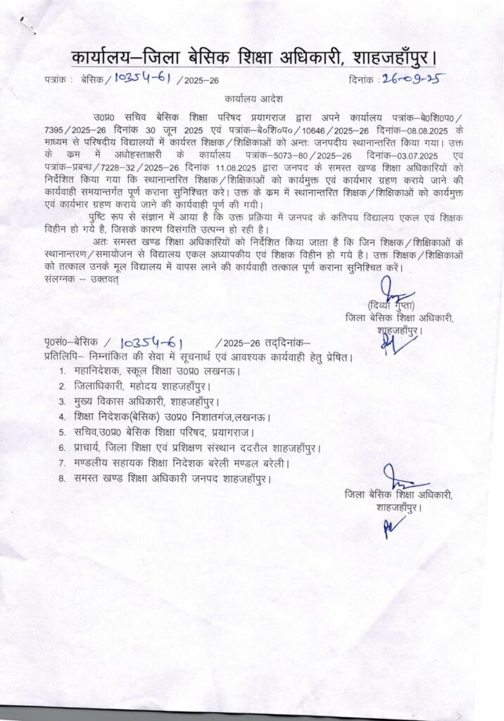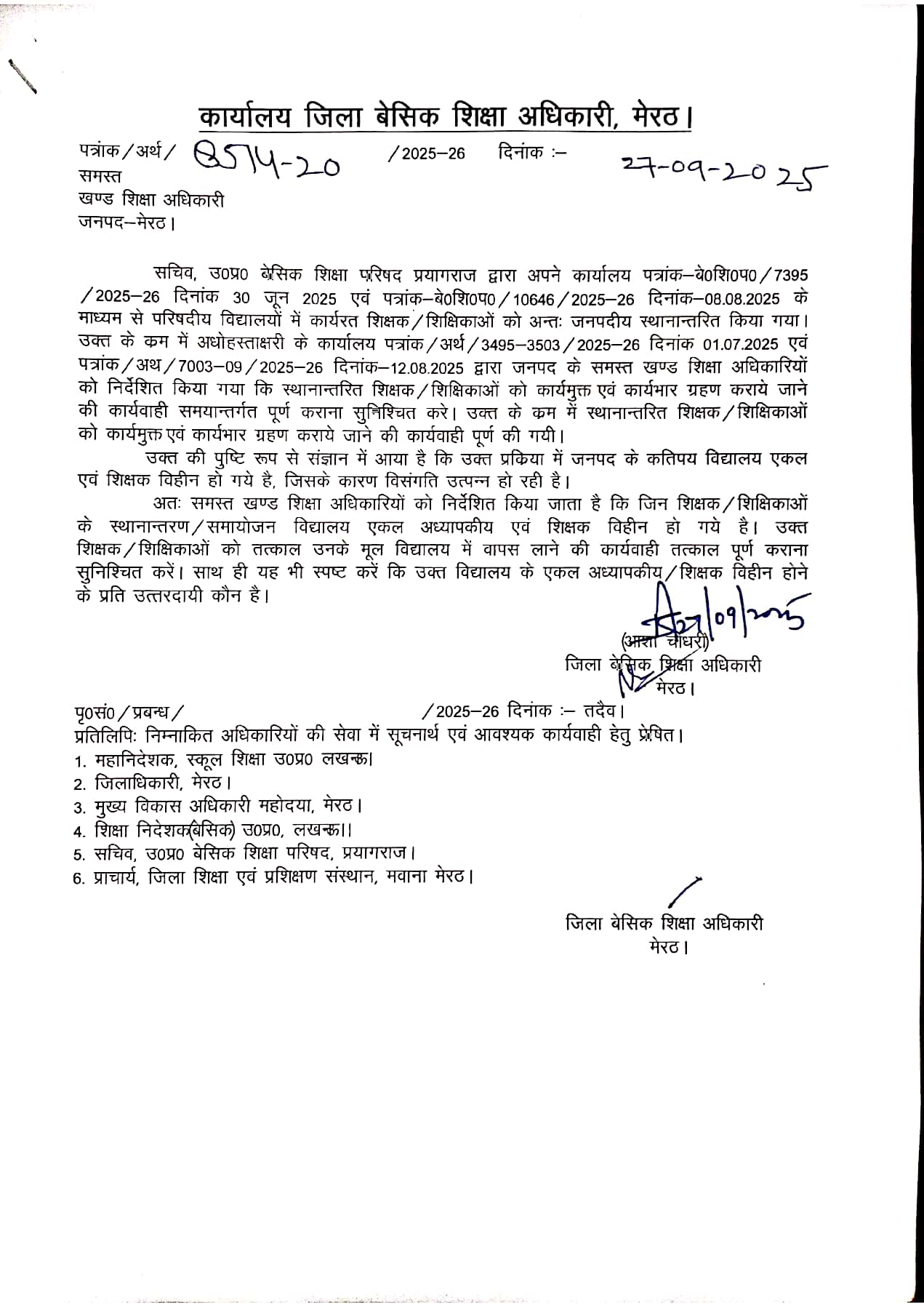 02 जिलों में एकल व शिक्षक विहीन हुए विद्यालयों के शिक्षकों की उनके मूल विद्यालय में वापसी हेतु ऑर्डर जारी