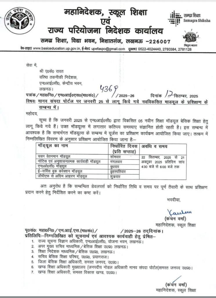 मानव संपदा पोर्टल पर जनवरी 2025 से लागू किये गये नवविकसित माडयूल के सम्बन्ध में संलग्न पत्र 4369 दिनांक 17 सितंबर के अनुसार (22 सितंबर 2025 से 21 अक्टूबर 2025 तक प्रति सप्ताह) प्रशिक्षण का आयोजन किया जा रहा है।