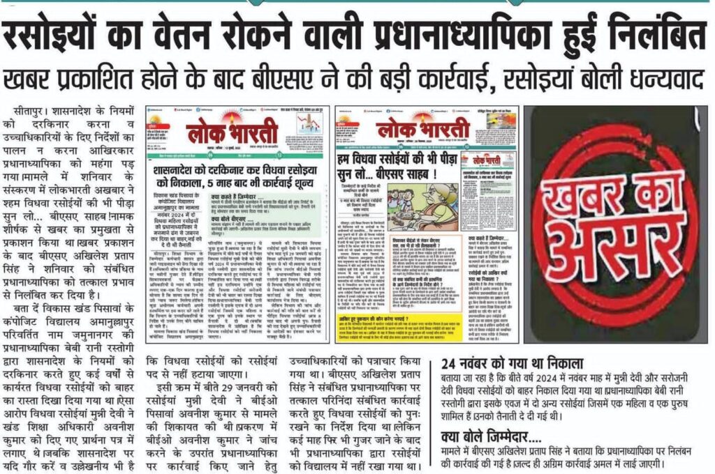 रसोईयों का वेतन रोकने वाली प्रधानाध्यापिका हुई निलंबित