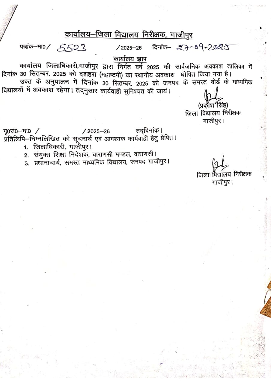 जनपद में 30 सितंबर को अवकाश घोषित आदेश