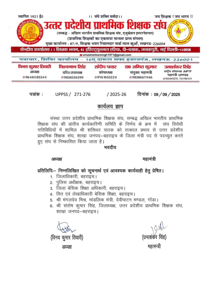 Home PRIMARY KA MASTER संघ विरोधी गतिविधियों के कारण श्री शक्तिधर पाठक को तत्काल प्रभाव से जिला मंत्री बहराइच पद से पदमुक्त कर संघ से निष्कासित किया गया।