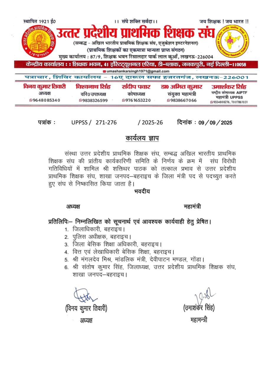 संघ विरोधी गतिविधियों के कारण श्री शक्तिधर पाठक को तत्काल प्रभाव से जिला मंत्री बहराइच पद से पदमुक्त कर संघ से निष्कासित किया गया।