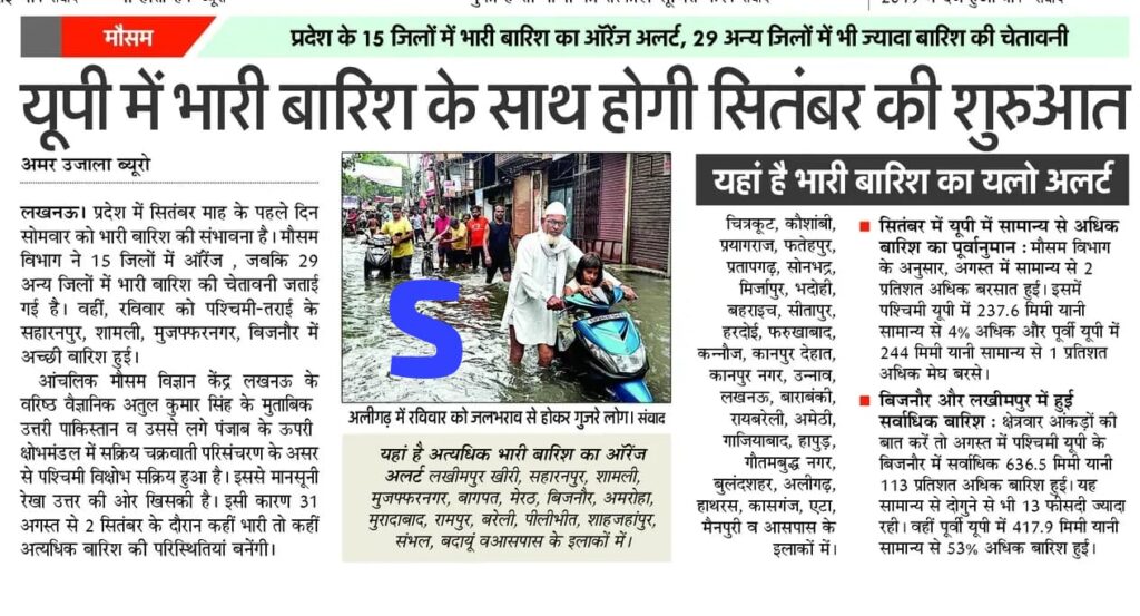 यूपी में भारी बारिश के साथ होगी सितंबर की शुरुआत,यहां है भारी बारिश का यलो अलर्ट