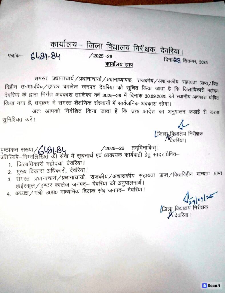जनपद में 30 सितंबर को रहेगा स्थानीय अवकाश