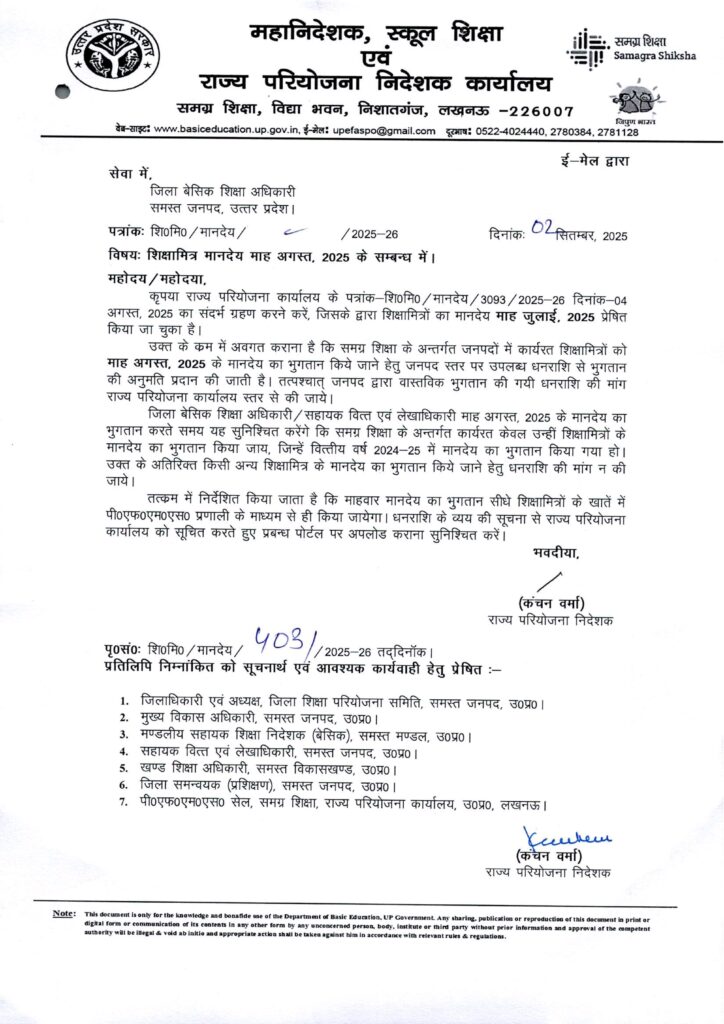 शिक्षामित्र मानदेय माह अगस्त, 2025 के सम्बन्ध में।