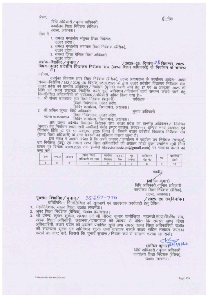 उत्तर प्रदेशीय विद्यालय निरीक्षक संघ (खण्ड शिक्षा अधिकारी) के निर्वाचन के सम्बन्ध में।