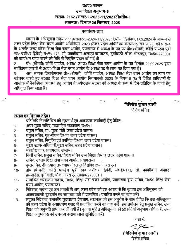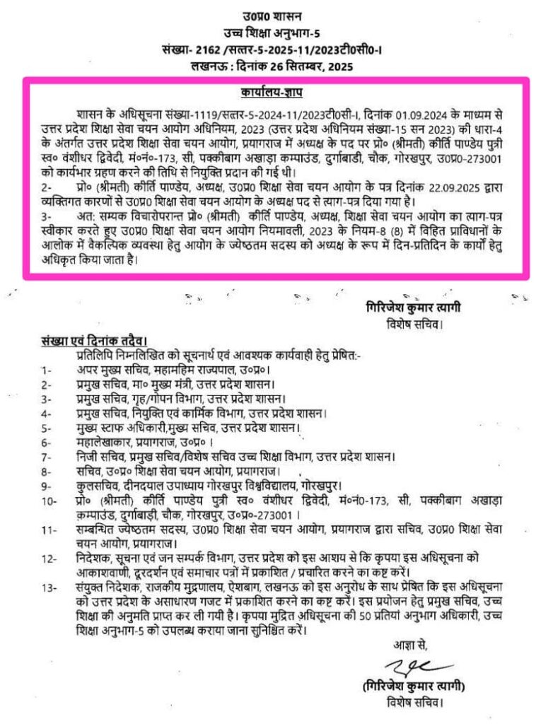प्रयागराज। उत्तर प्रदेश शिक्षा सेवा चयन आयोग की अध्यक्ष प्रो. कीर्ति पांडेय ने सालभर में ही पद छोड़ दिया है। उन्होंने 22 सितंबर को शासन को इस्तीफा भेजा था जो स्वीकार कर लिया गया। आयोग के सदस्य और रामसुचित ने कार्यवाहक अध्यक्ष का कार्यभार ग्रहण कर लिया।