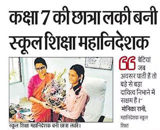लखनऊ में उच्च प्राथमिक विद्यालय (1-8) 35वीं पीएसी बटालियन महानगर जोन तीन की कक्षा सात की छात्रा कुमारी लकी सिंह ने डीजी मोनिका रानी के पद का दायित्व संभाला। वहीं यूपीएस गुलाम हुसैन पुरवा जोन-2 नगर की कक्षा 8 की छात्रा कुमारी नैना ने शिक्षा निदेशक, बेसिक शिक्षा का दायित्व ग्रहण कर विभागीय कार्यों को गति दिया। इनके अलावा कक्षा 7 की छात्रा कुमारी नैनसी ने वरिष्ठ विशेषज्ञ, गुणवत्ता शिक्षा, कक्षा 8 की छात्रा कुमारी अनुष्का ने निदेशक, एससीईआरटी, कक्षा 8 की छात्रा इकरा शरीफ ने उप शिक्षा निदेशक प्राइमरी का दायित्व संभाला।