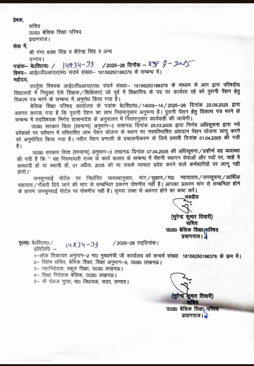 संयुक्त समायोजित शिक्षक संघ के जिलाध्यक्ष श्री गंगा बक्श सिंह जी के द्वारा माननीय विधायक श्री पंकज गुप्ता जी को दिए गए प्रार्थना पत्र को जनसुनवाई के माध्यम से निस्तारण करते हुए सचिव बेसिक शिक्षा परिषद महोदय द्वारा कहा गया है कि बेसिक शिक्षा परिषद कार्यालय के पत्रांक बे0शि0प0/14009-14/2025-26 दिनांक 22.09.2025 द्वारा अवगत कराया गया है कि पुरानी पेंशन का लाभ नियमानुसार अनुमन्य है। पुरानी पेंशन हेतु विकल्प पत्र भरने के संबंध में तदविषयक निर्गत शासनादेश के अनुपालन में नियमानुसार कार्रवाई की जाएगी।