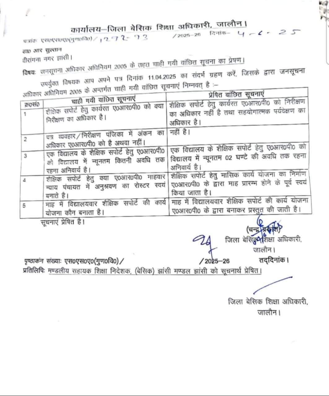 ARP : पत्र व्यवहार /निरीक्षण पंजिका पर अंकन का अधिकार नहीं एक विद्यालय में न्यूनतम दो घंटे शैक्षिक सपोर्ट की जिम्मेदारी…जनसूचना RTI 😊👇