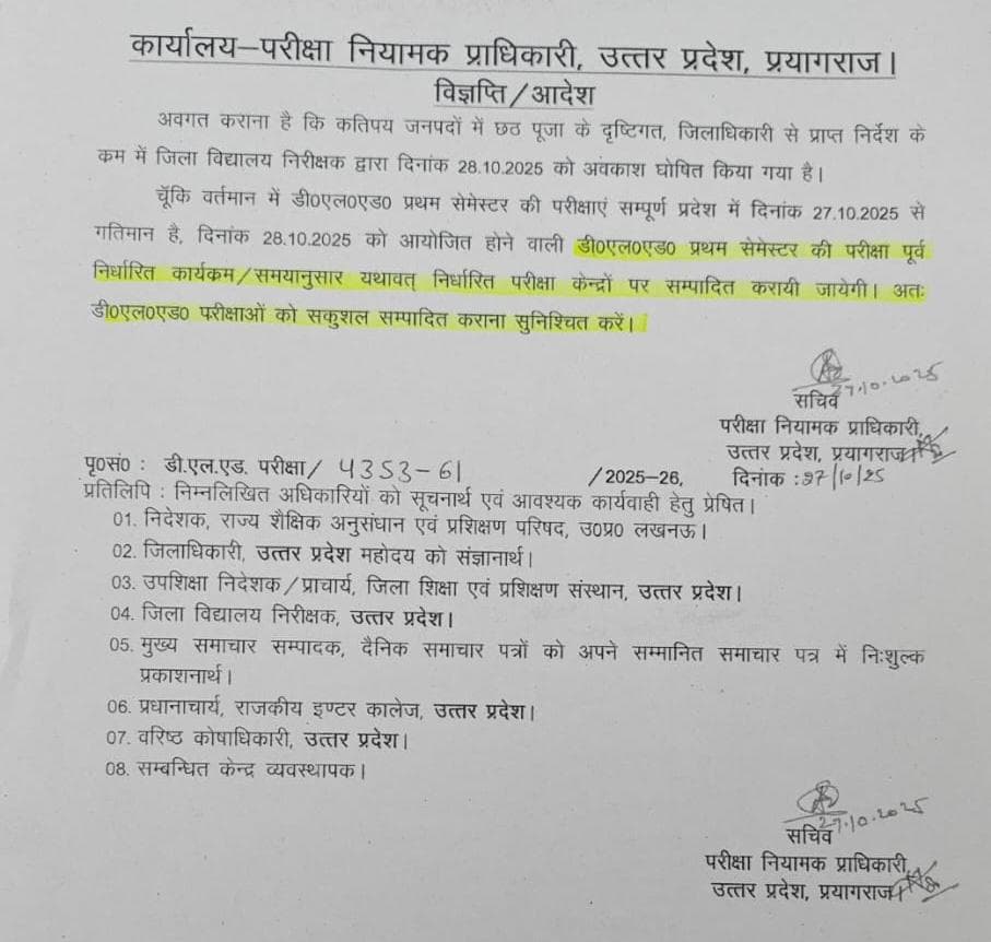 Home PRIMARY KA MASTER NEWS डीएलएड प्रथम सेमेस्टर की परीक्षा कल यानी 28 अक्टूबर को अपने निर्धारित परीक्षा केंद्रों पर समयानुसार संपन्न होगी, छठ पूजा की अवकाश नहीं रहेगा💥💯✅