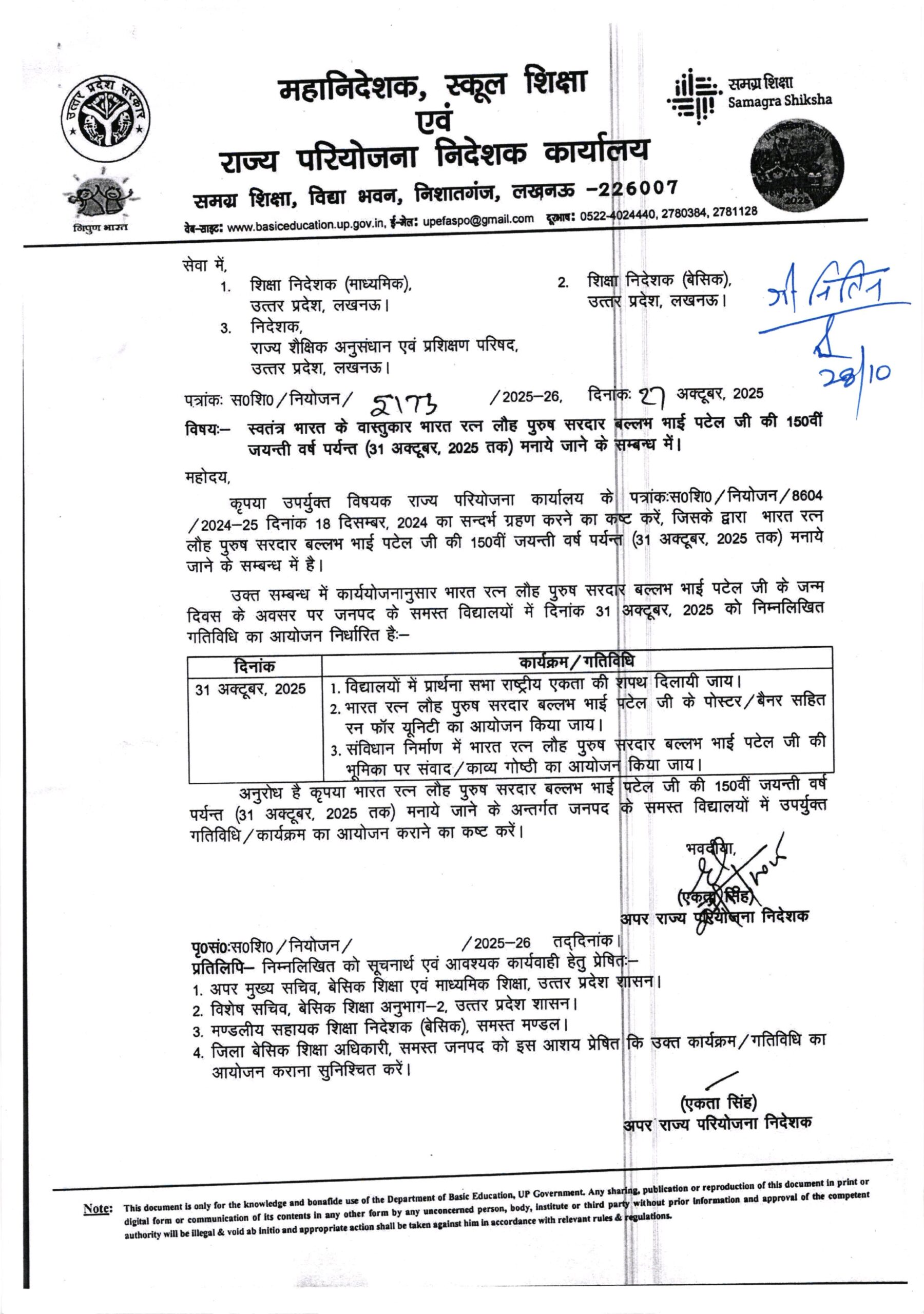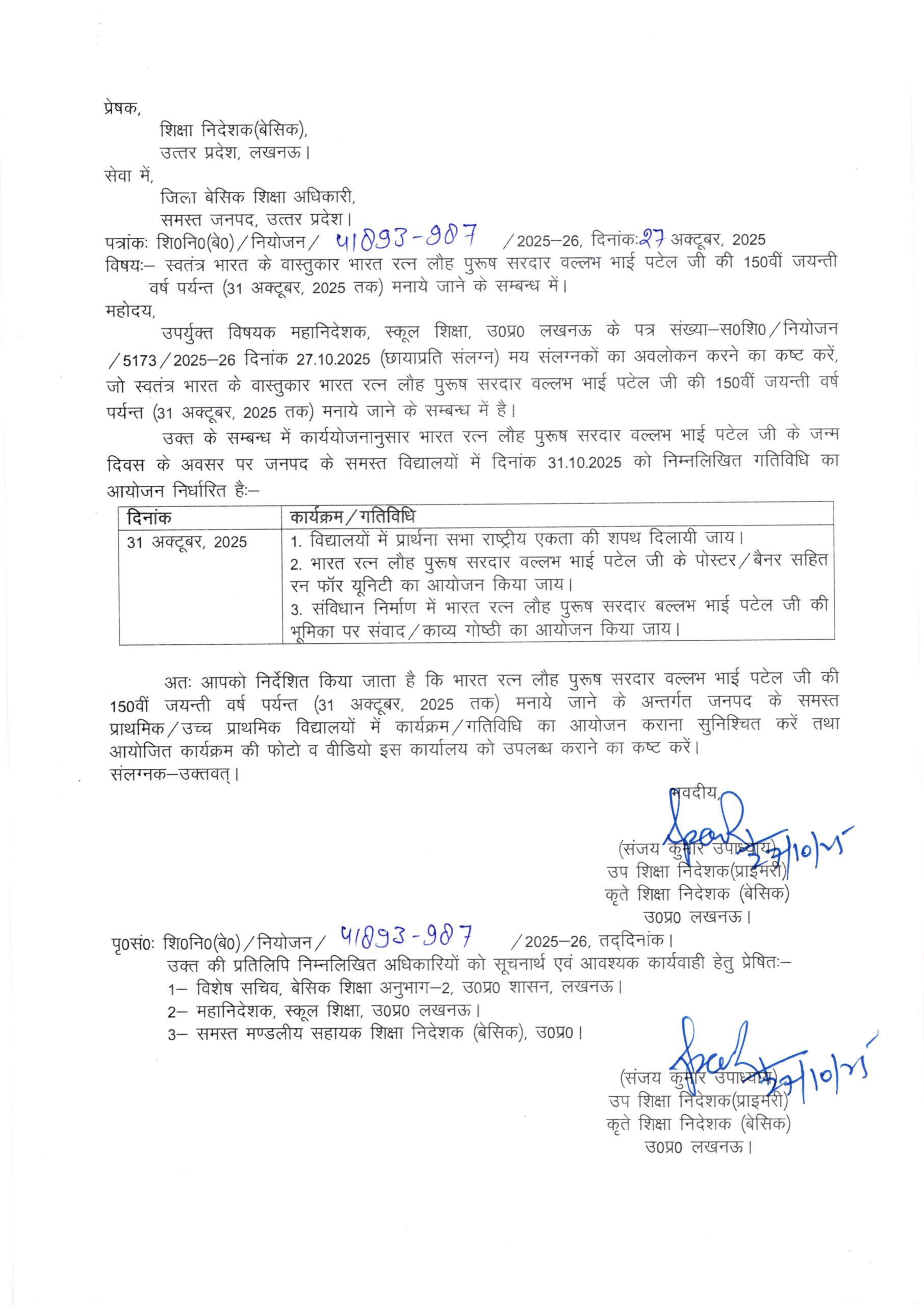 Home PRIMARY KA MASTER स्वतंत्र भारत के वास्तुकार भारत रत्न लौह पुरुष सरदार वल्लभ भाई पटेल जी की 150वीं जयन्त वर्ष पर्यन्त (31 अक्टूबर, 2025 तक) मनाये जाने के सम्बन्ध में।