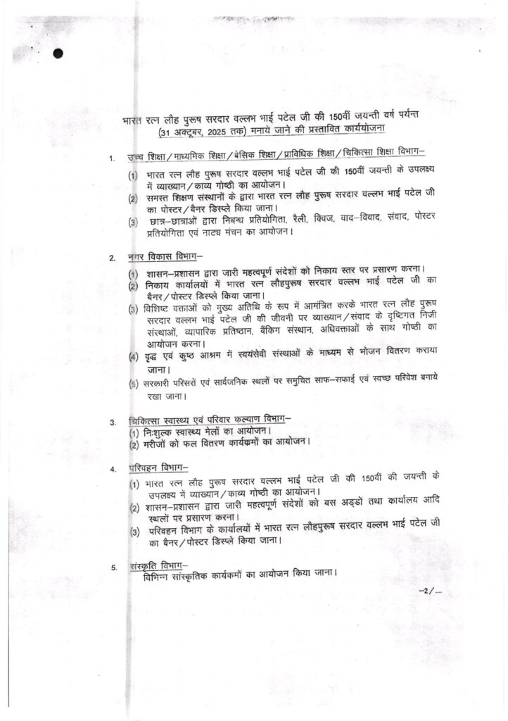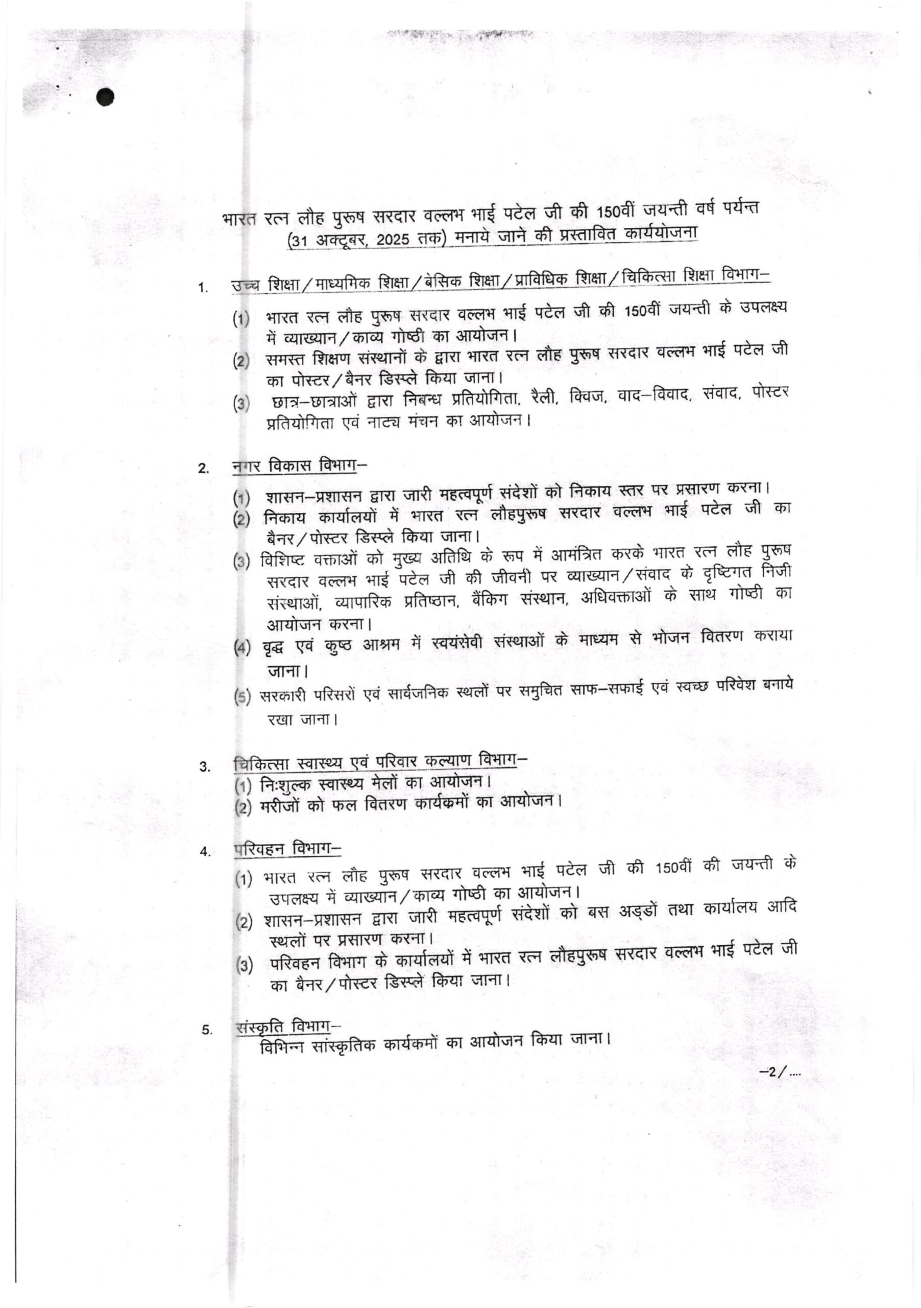 स्वतंत्र भारत के वास्तुकार भारत रत्न लौह पुरुष सरदार वल्लभ भाई पटेल जी की 150वीं जयन्त वर्ष पर्यन्त (31 अक्टूबर, 2025 तक) मनाये जाने के सम्बन्ध में।