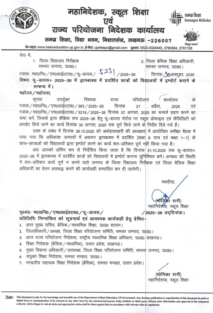 अतः आपको अंतिम रूप से निर्देशित किया जाता है कि दिनांक 31.10.2025 तक यू-डायस+ 2025-26 में ड्रापबाक्स में प्रदर्शित छात्रों को विद्यालयों में इम्पोर्ट कराना सुनिश्चित करें। अन्यथा की स्थिति में शत-प्रतिशत कार्य पूर्ण न करने वाले जनपद के जिला विद्यालय निरीक्षक एवं जिला बेसिक शिक्षा अधिकारी का वेतन अवरूद्ध करने की कार्यवाही सम्पादित कर दी जायेगी।