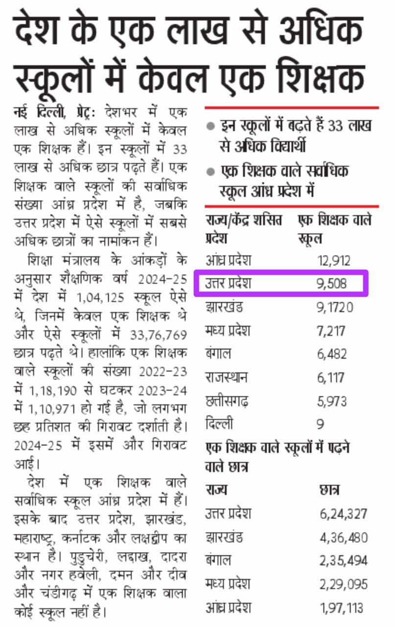 शिक्षा मंत्रालय की 2024-25 की रिपोर्ट के मुताबिक, देश में कुल 1,04,125 एक शिक्षक वाले स्कूल हैं। इनमें सबसे ज्यादा स्कूल आंध्र प्रदेश में हैं, जबकि इन स्कूलों में सबसे अधिक छात्र उत्तर प्रदेश में पढ़ते हैं। आंध्र प्रदेश में 12,912, उत्तर प्रदेश में 9,508, झारखंड में