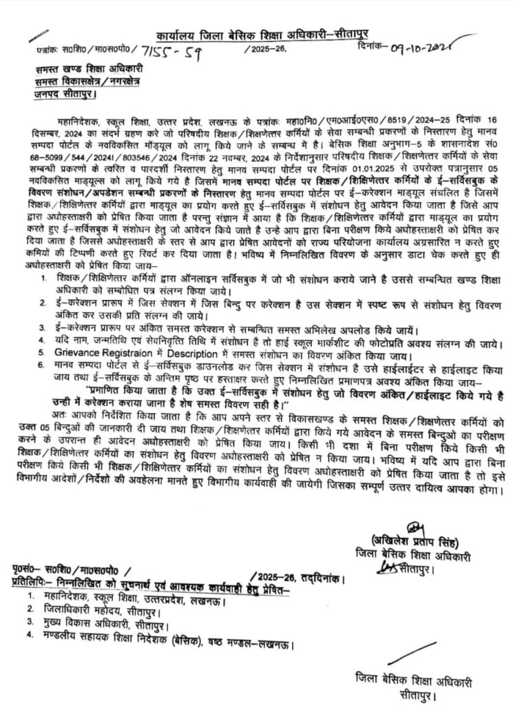 अतः आपको निर्देशित किया जाता है कि आप अपने स्तर से विकासखण्ड के समस्त शिक्षक / शिक्षणेत्तर कर्मियों को उक्त 05 बिन्दुओं की जानकारी दी जाय तथा शिक्षक / शिक्षणेत्तर कर्मियों द्वारा किये गये आवेदन के समस्त बिन्दुओं का परीक्षण करने के उपरान्त ही आवेदन अधोहस्ताक्षरी को प्रेषित किया जाय। किसी भी दशा में बिना परीक्षण किये किसी भी शिक्षक / शिक्षिणेत्तर कर्मियों का संशोधन हेतु विवरण अधोहस्ताक्षरी को प्रेषित न किया जाय। भविष्य में यदि आप द्वारा बिना परीक्षण किये किसी भी शिक्षक / शिक्षिणेत्तर कर्मियों का संशोधन हेतु विवरण अधोहस्ताक्षरी को प्रेषित किया जाता है तो इसे विभागीय आदेशों / निर्देशो की अवहेलना मानते हुए विभागीय कार्यवाही की जायेगी जिसका सम्पूर्ण उत्तर दायित्व आपका होगा।