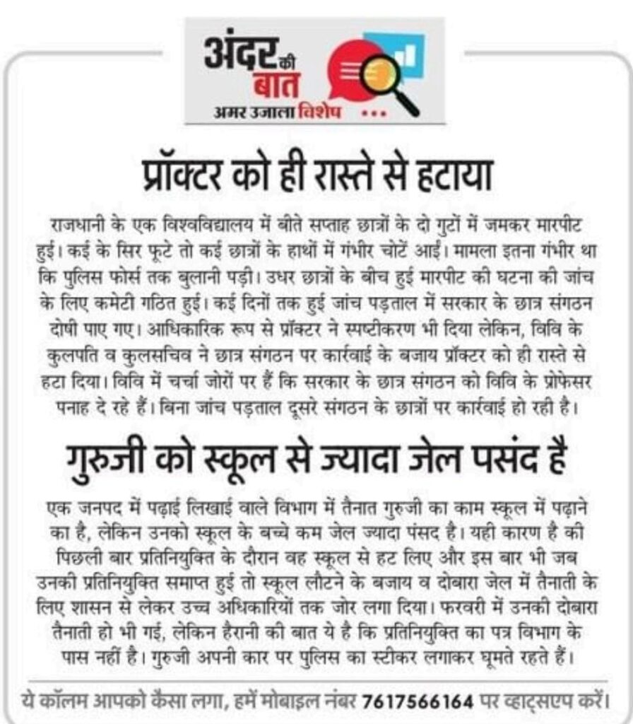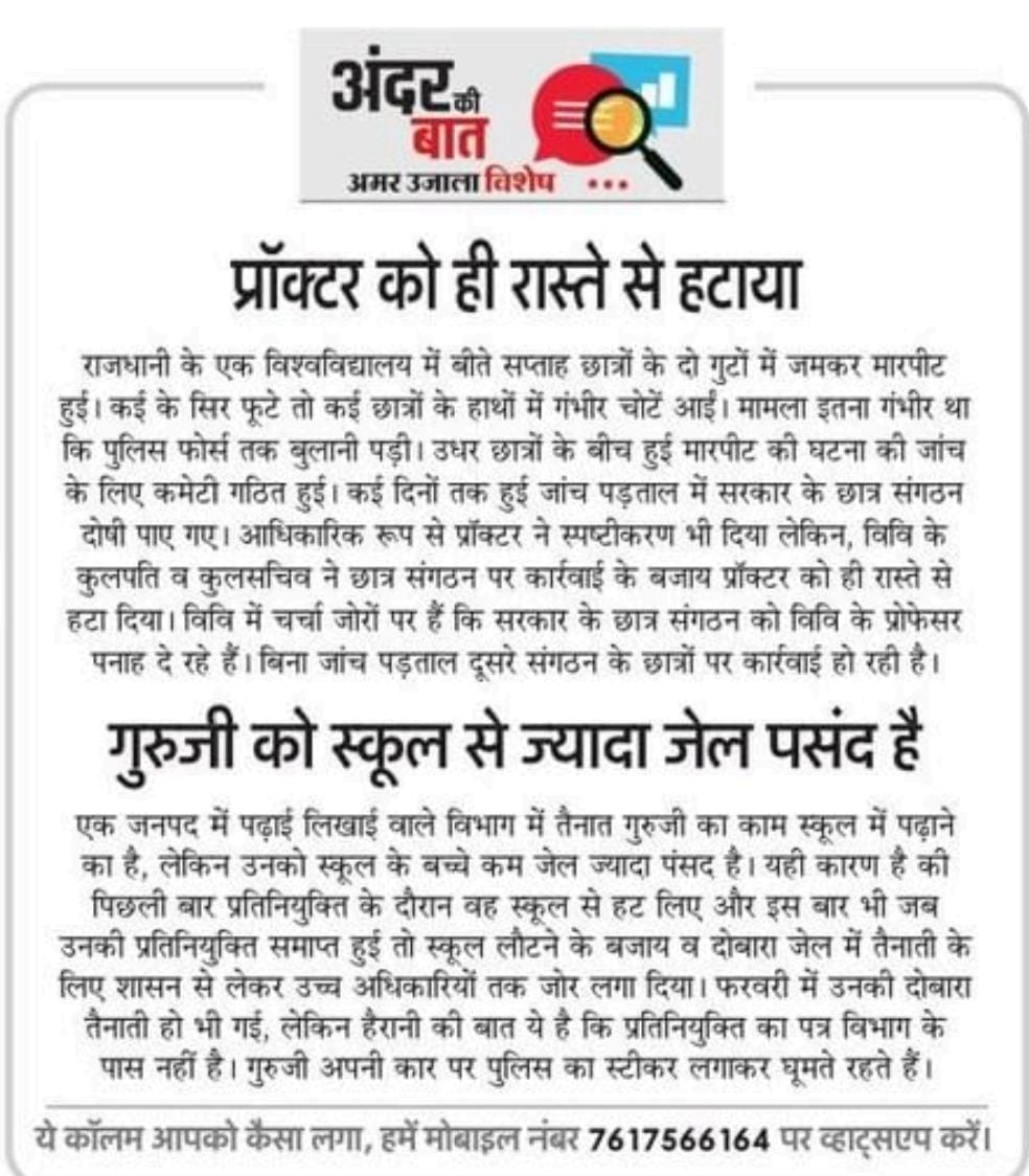 *एक जनपद में पढ़ाई लिखाई वाले विभाग में तैनात गुरुजी का काम स्कूल में पढ़ाने का है, लेकिन उनको स्कूल के बच्चे कम जेल ज्यादा पंसद है। यही कारण है की पिछली बार प्रतिनियुक्ति के दौरान वह स्कूल से हट लिए और इस बार भी जब उनकी प्रतिनियुक्ति समाप्त हुई तो स्कूल लौटने के बजाय व दोबारा जेल में तैनाती के लिए शासन से लेकर उच्च अधिकारियों तक जोर लगा दिया। फरवरी में उनकी दोबारा तैनाती हो भी गई, लेकिन हैरानी की बात ये है कि प्रतिनियुक्ति का पत्र विभाग के पास नहीं है। गुरुजी अपनी कार पर पुलिस का स्टीकर लगाकर घूमते रहते हैं।*