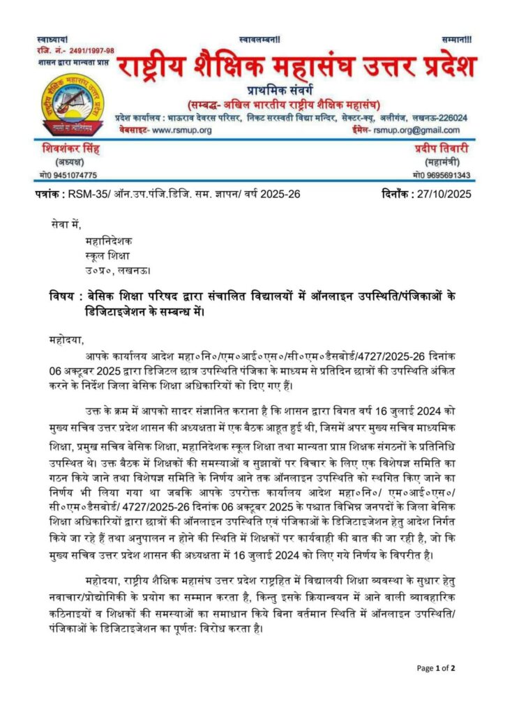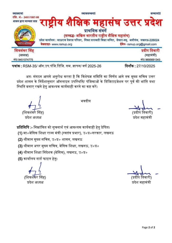 विशेषज्ञ समिति का निर्णय आने तक मुख्य सचिव उत्तर प्रदेश शासन के निर्देशानुसार ऑनलाइन उपस्थिति/पंजिकाओं के डिजिटाइजेशन पर पूर्व की भांति यथास्थिति बनाए रखने की मांग को लेकर RSMUP का महानिदेशक स्कूल शिक्षा को ज्ञापन