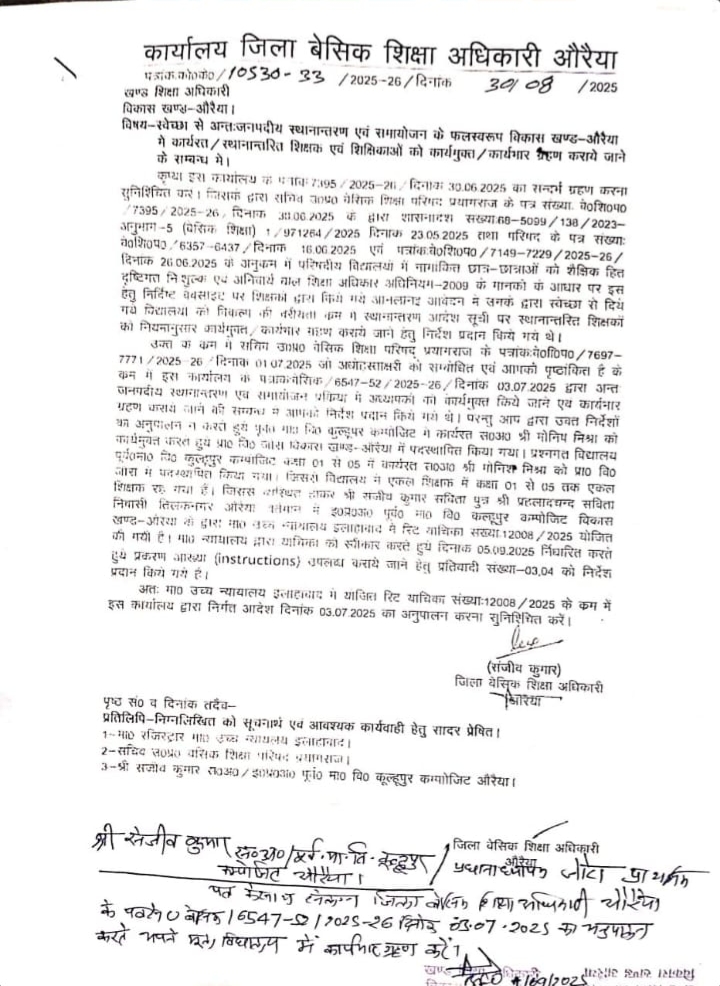 स्वेच्छा से अन्तः जनपदीय स्थानान्तरण एवं समायोजन के फलस्वरूप विकास खण्ड में कार्यरत / स्थानानारित शिक्षक एवं शिक्षिकाओं को कार्यमुक्त / कार्यभार राहण कराये जाने के सम्बन्ध में।