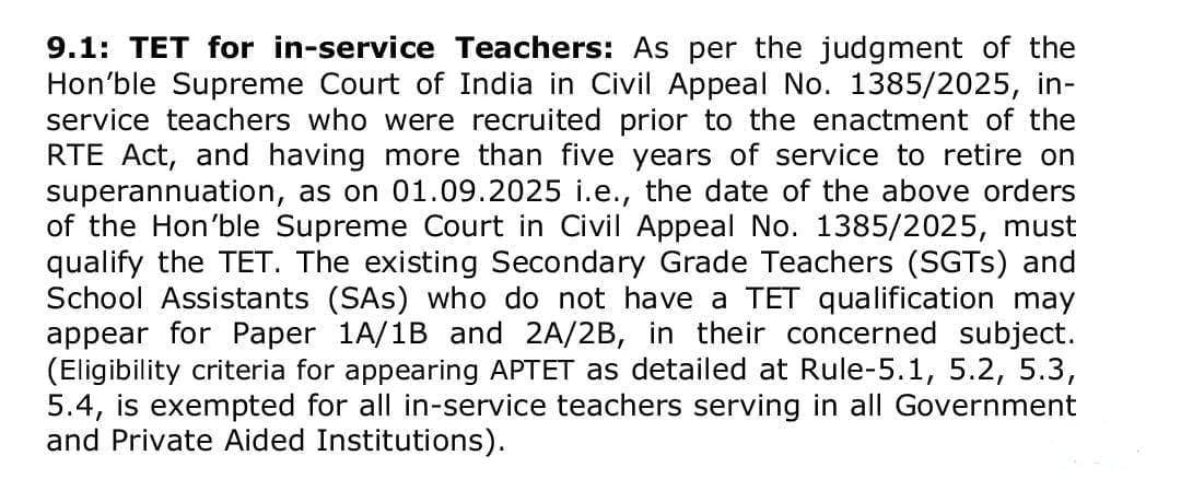 *ЁЯТРAs per the judgment of the Hon’ble Supreme Court of India in Civil Appeal No. 1385/2025, in-service teachers who were recruited prior to the enactment of the RTE Act, and having more than five years of service to retire on superannuation, as on 01.09.2025 i.e., the date of the above orders of the Hon’ble Supreme Court in Civil Appeal No. 1385/2025, must qualify the TET.*