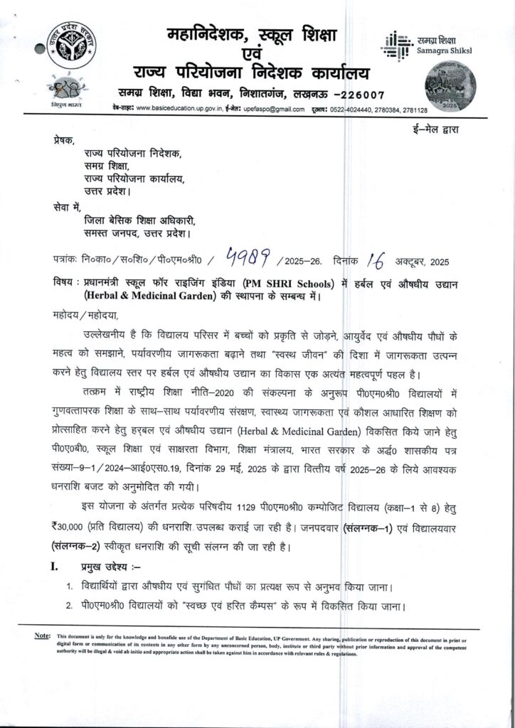Home PRIMARY KA MASTER प्रधानमंत्री स्कूल फॉर राइजिंग इंडिया में हर्बल एवं औषधीय उद्यान (Herbal & Medicinal Garden) की स्थापना के सम्बन्ध में।