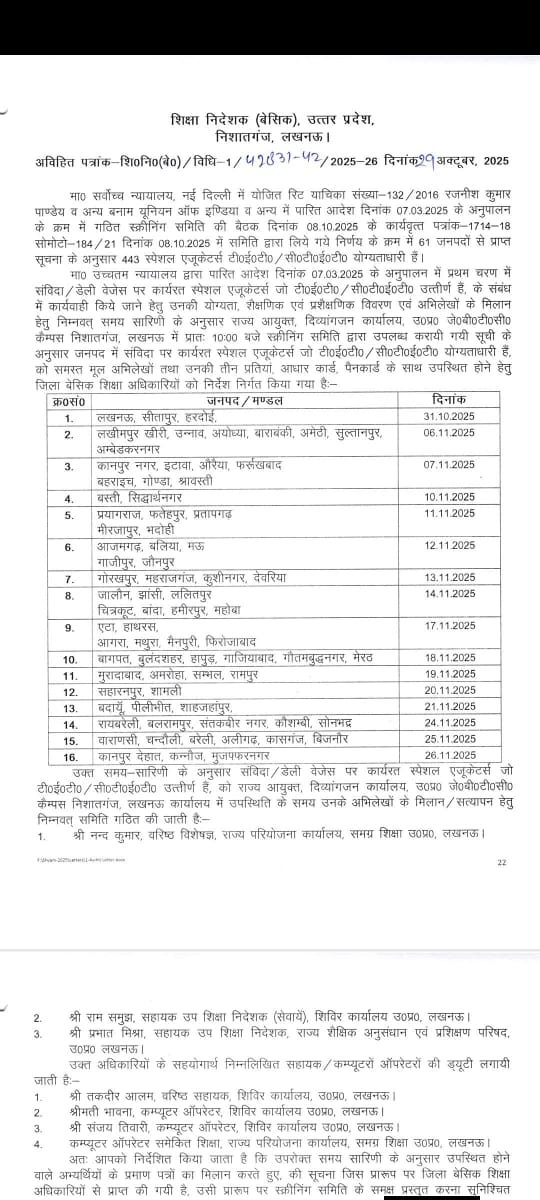 माननीय उच्चतम न्यायालय के आदेश के क्रम में समग्र शिक्षा में संविदा पर कार्यरत सभी टेट/सीटेट उत्तीर्ण स्पेशल एजुकेटर्स के अभिलेखों के मिलान हेतु जनपदवार तिथियां तय..