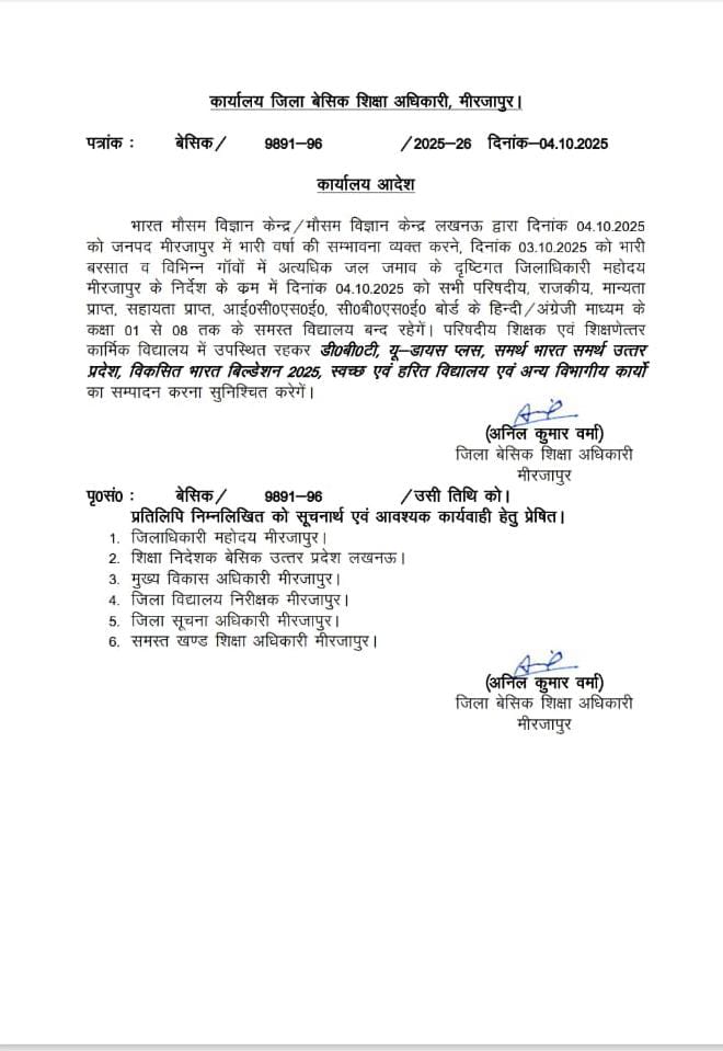 *#breakingNews #मिर्ज़ापुर : भारी वर्षा के कारण जिले में आज कक्षा 1 से 8 तक के सभी विद्यालय बंद रहेंगे।जिलाधिकारी पवन कुमार गंगवार के निर्देश पर BSA ने यह आदेश जारी किया गया है।*