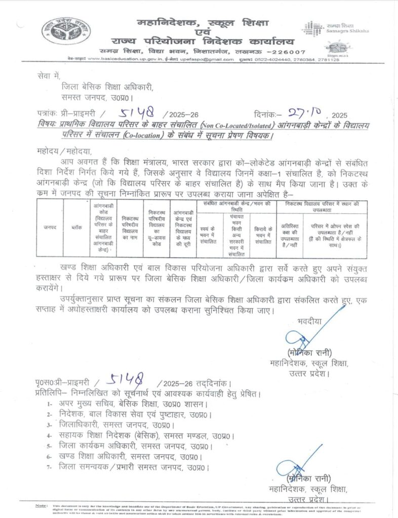प्राथमिक विद्यालय परिसर के बाहर संचालित (Non Co-Located/Isolated) आंगनबाड़ी केन्द्रों के विद्यालय परिसर में संचालन (Co-location) के संबंध में सूचना प्रेषण विषयक ।
