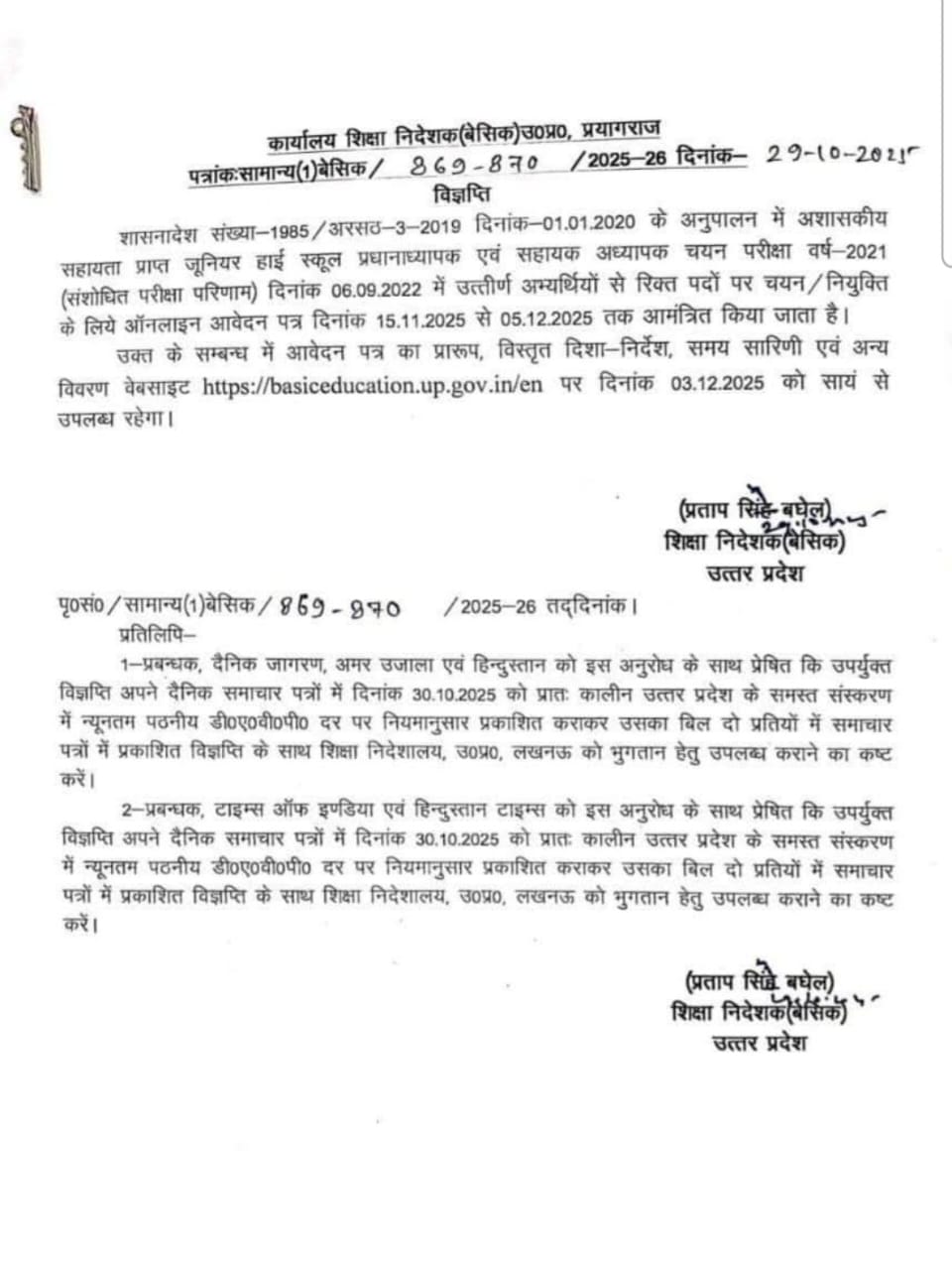 यूपी जूनियर एडेड शिक्षक भर्ती 2021 ऑनलाइन आवेदन के लिए विज्ञप्ति जारी