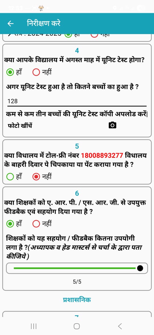 अत्यंत महत्वपूर्ण सूचना ….प्रेरणा निरीक्षण ऐप जिसके द्वारा खंड शिक्षा अधिकारी और अन्य अधिकारी निरीक्षण करते हैं उसमें यह ऐड किया गया है कि है कि यूनिट टेस्ट हुआ है या नहीं और हुआ है तो कितने बच्चों का। साथ ही साथ यूनिट टेस्ट की कम से कम तीन कॉपियां निरीक्षण में अपलोड करनी है ।अतः समस्त विद्यालय समस्त बच्चों की कॉपियों का मूल्यांकन करके अपनी स्थिति बिल्कुल ठीक रखे। निरीक्षण में कॉपियां देखी जाएंगी और फोटो अपलोड किए जाएंगेँ.