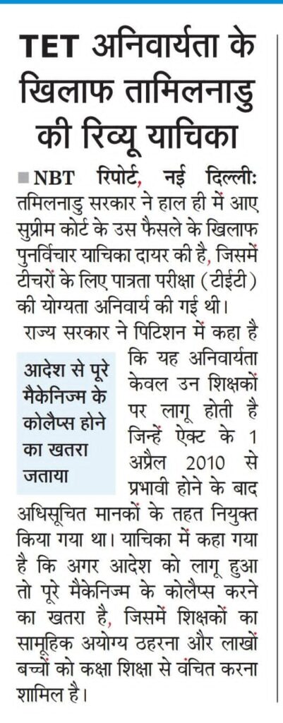 *तमिलनाडु सरकार ने हाल ही में आए सुप्रीम कोर्ट के उस फैसले के खिलाफ पुनर्विचार याचिका दायर की है, जिसमें टीचरों के लिए पात्रता परीक्षा (टीईटी) की योग्यता अनिवार्य की गई थी।*
