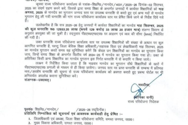 SSA के शिक्षा मित्रों के सितम्बर माह के मानदेय की ग्रांट शासन से जारी,