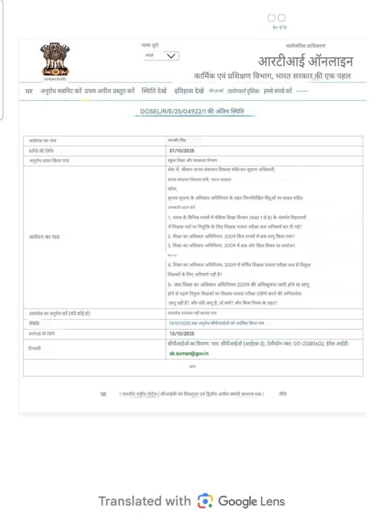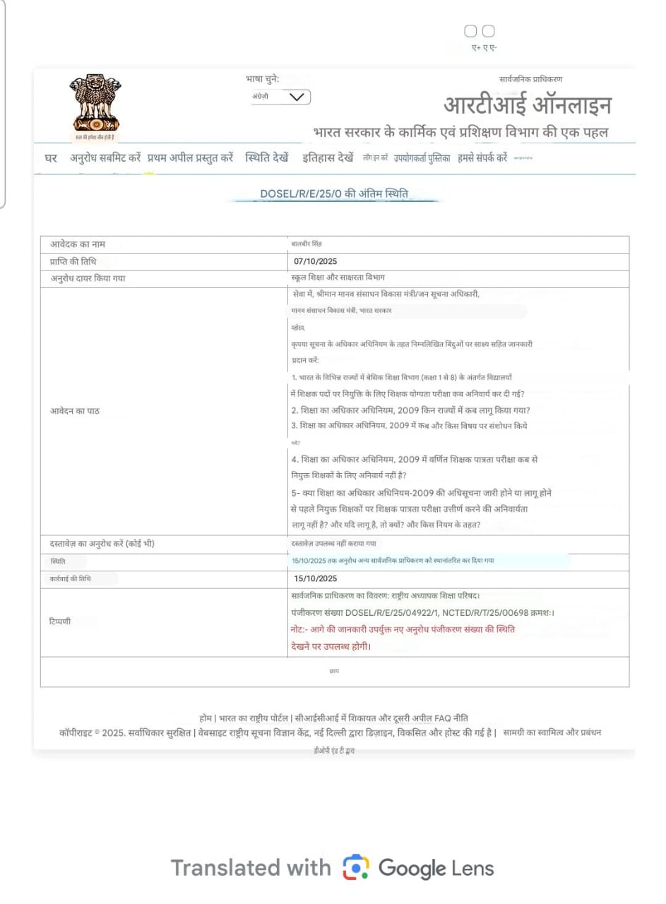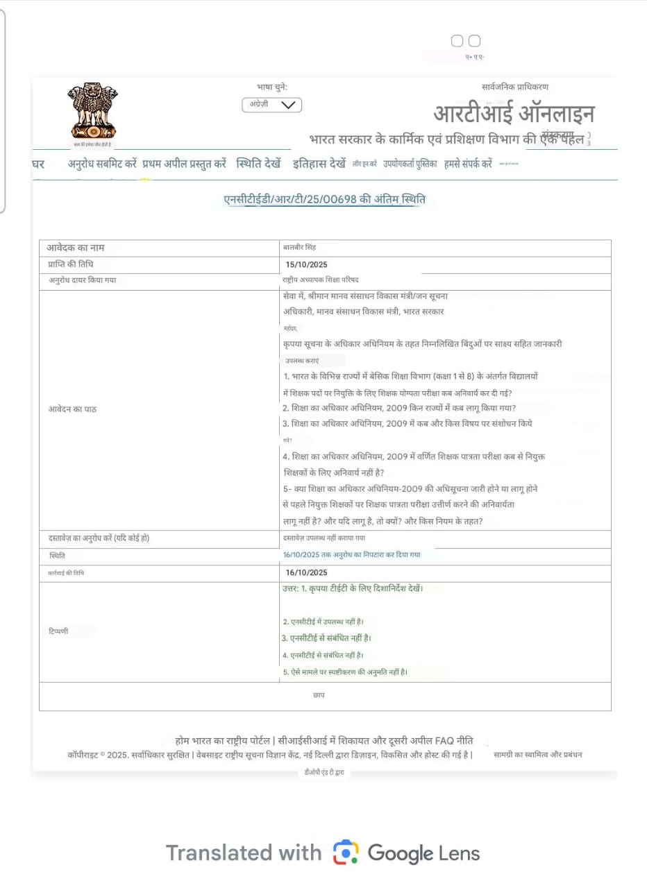 RTI answer : टीईटी अनिवार्यता पर डाली गई RTI का यह आया उत्तर