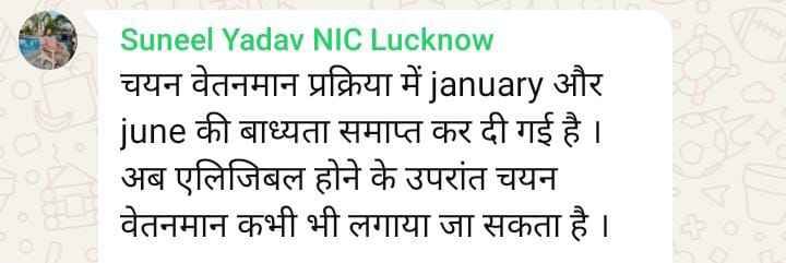 चयन वेतनमान प्रक्रिया में january और june की बाध्यता समाप्त कर दी गई है। अब एलिजिबल होने के उपरांत चयन वेतनमान कभी भी लगाया जा सकता है।