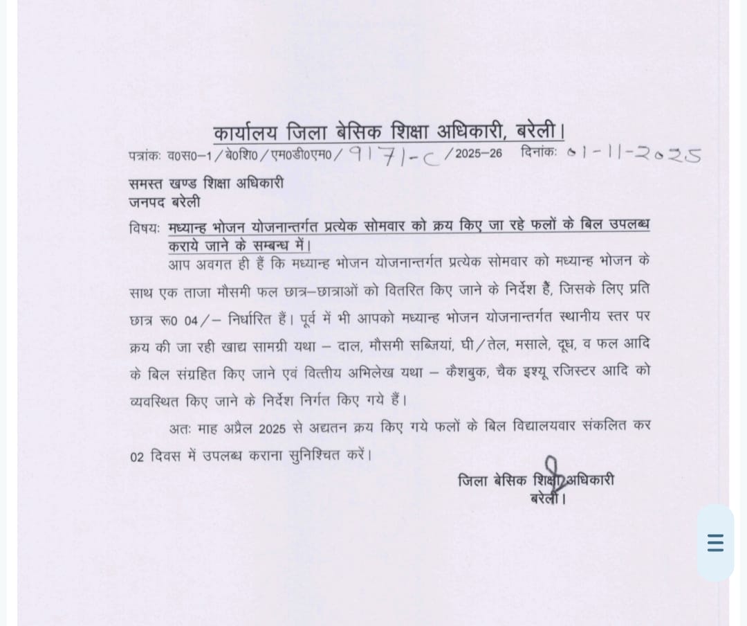 MDM योजना: सोमवार को छात्रों को वितरित फलों के बिल उपलब्ध कराने का आदेश