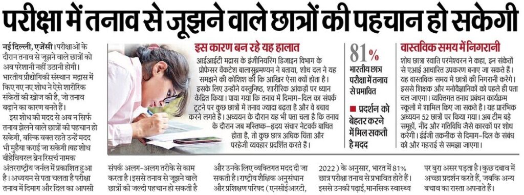 इस शोध की मदद से अब न सिर्फ तनाव झेलने वाले छात्रों की पहचान हो सकेगी, बल्कि वक्त रहते उन्हें मदद भी मुहैया कराई जा सकेगी।यह शोध बीहेवियरल ब्रेन रिसर्च नामक अंतरराष्ट्रीय जर्नल में प्रकाशित हुआ है। अध्ययन से पता चलता है परीक्षा तनाव में दिमाग और दिल का आपसी संपर्क अलग-अलग तरीके से काम करता है। इससे तनाव से जूझने वाले छात्रों की जल्दी पहचान हो सकती है और उनके लिए व्यक्तिगत मदद दी जा सकती है। राष्ट्रीय शैक्षिक अनुसंधान और प्रशिक्षण परिषद (एनसीईआरटी, 2022) के अनुसार, भारत में 81% छात्र परीक्षा तनाव से प्रभावित होते हैं। इससे उनकी पढ़ाई,मानसिक स्वास्थ्य पर बुरा असर पड़ता है। कुछ दबाव में अच्छा प्रदर्शन करते हैं, जबकि अन्य बचाव का रास्ता अपनाते हैं।