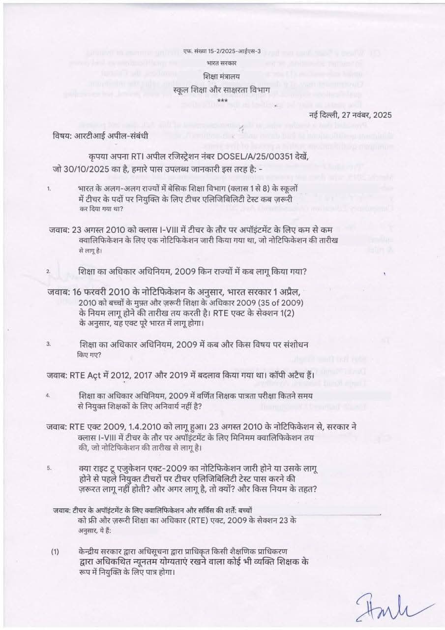 सेवारत टीचर्स पर TET लागू है कि नही, इस प्रश्न पर शिक्षा मंत्रालय भारत सरकार से RTI के तहत जवाब मांगा गया था इस मुद्दे पर शिक्षा मंत्रालय भारत सरकार ने अपना जवाब दिया है जिसे आप इस नीचे दिए गए लेटर में पढ़ सकते है।