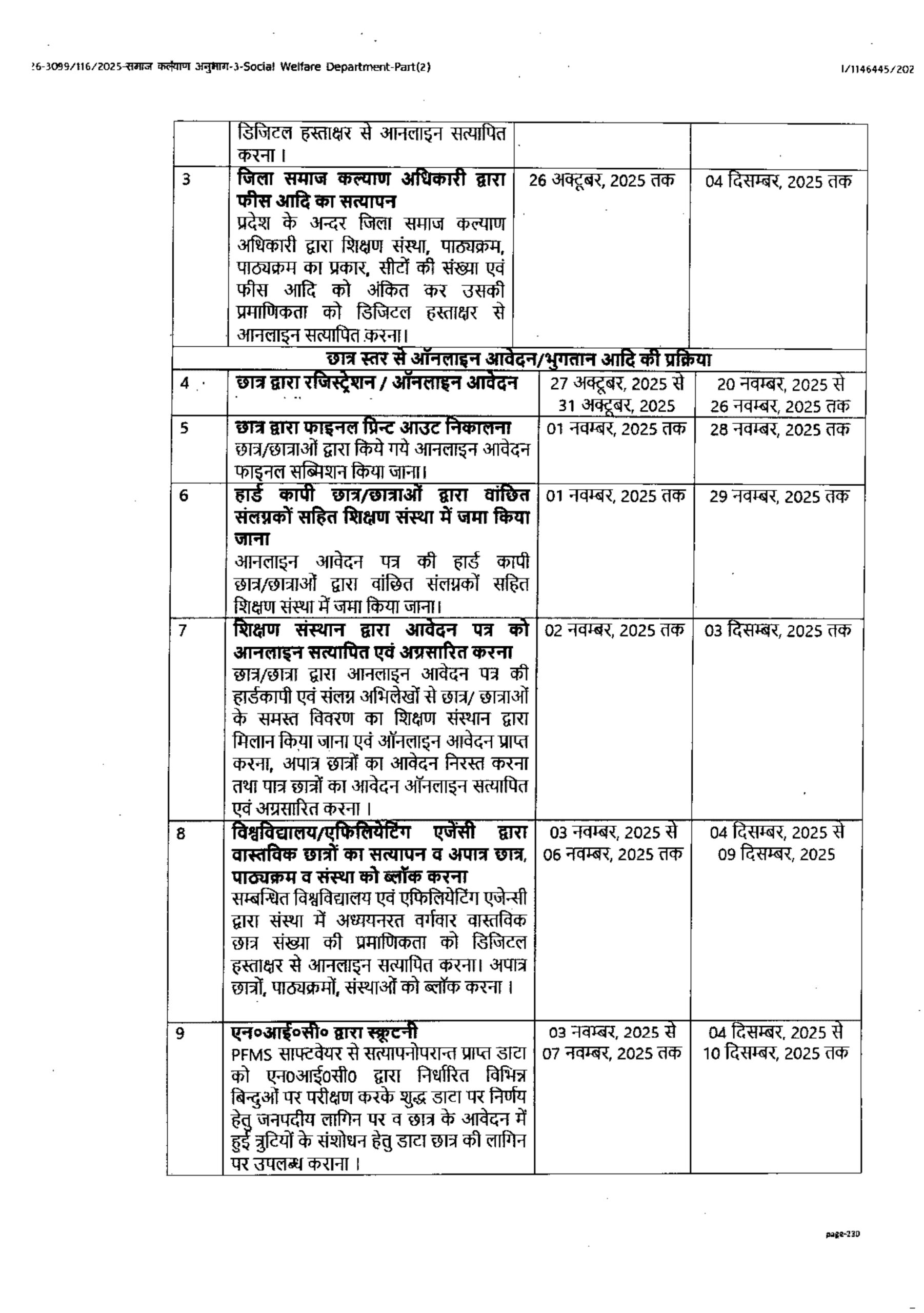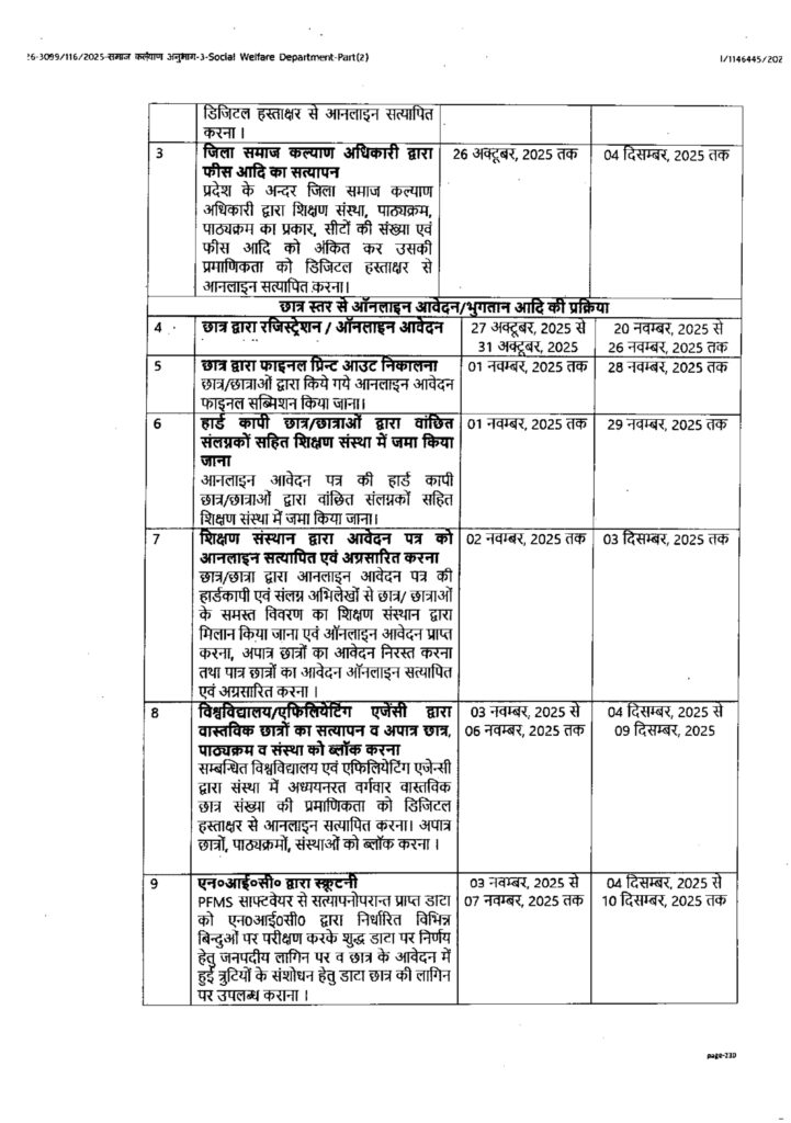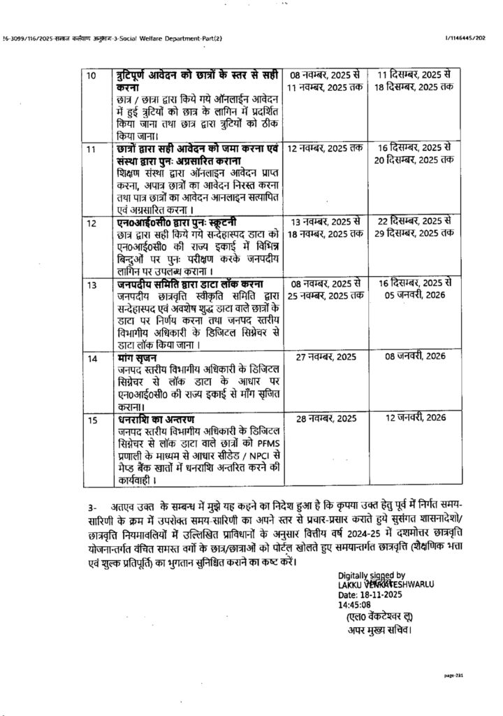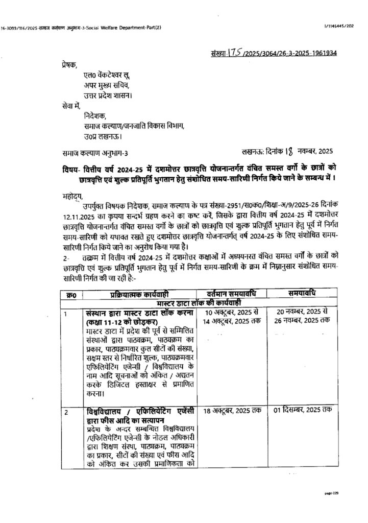 वित्तीय वर्ष 2024-25 में दशमोत्तर छात्रवृत्ति योजनान्तर्गत वंचित समस्त वर्गों के छात्रों को छात्रवृत्ति एवं शुल्क प्रतिपूर्ति भुगतान हेतु संशोधित समय सारिणी निर्गत किये जाने के सम्बन्ध में