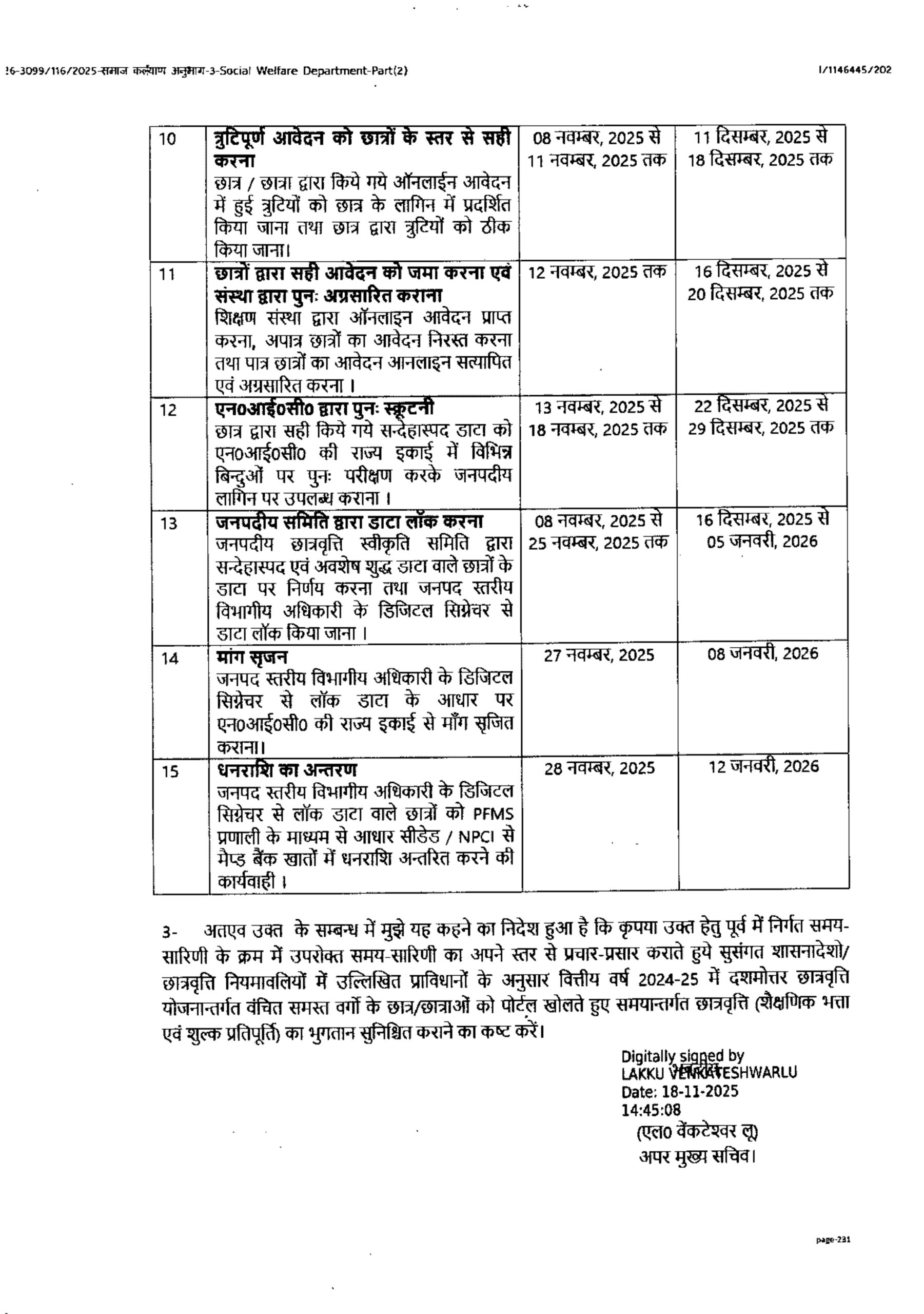 वित्तीय वर्ष 2024-25 में दशमोत्तर छात्रवृत्ति योजनान्तर्गत वंचित समस्त वर्गों के छात्रों को छात्रवृत्ति एवं शुल्क प्रतिपूर्ति भुगतान हेतु संशोधित समय सारिणी निर्गत किये जाने के सम्बन्ध में ।