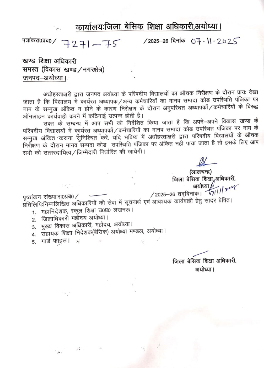 अध्यापक उपस्थिति पंजिका पर मानव संपदा कोड अंकित किए जाने के संबंध में bsa महोदय का निर्देश