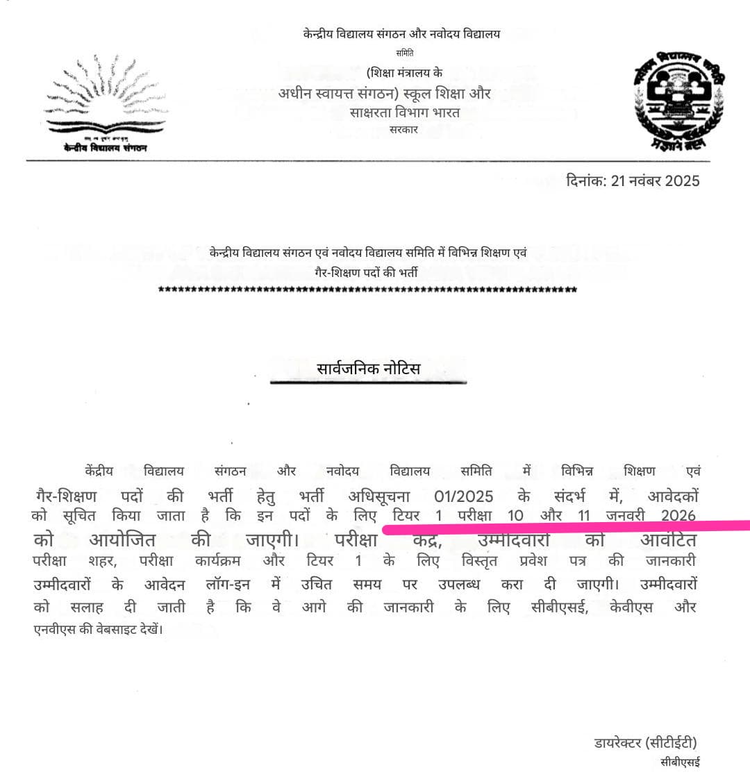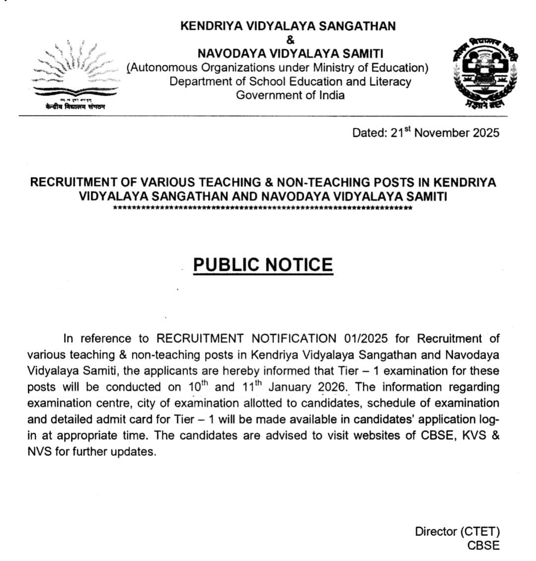 KVS/ NVS TIER- 1 की परीक्षा 10 और 11 जनवरी 2026 को संपन्न होगी