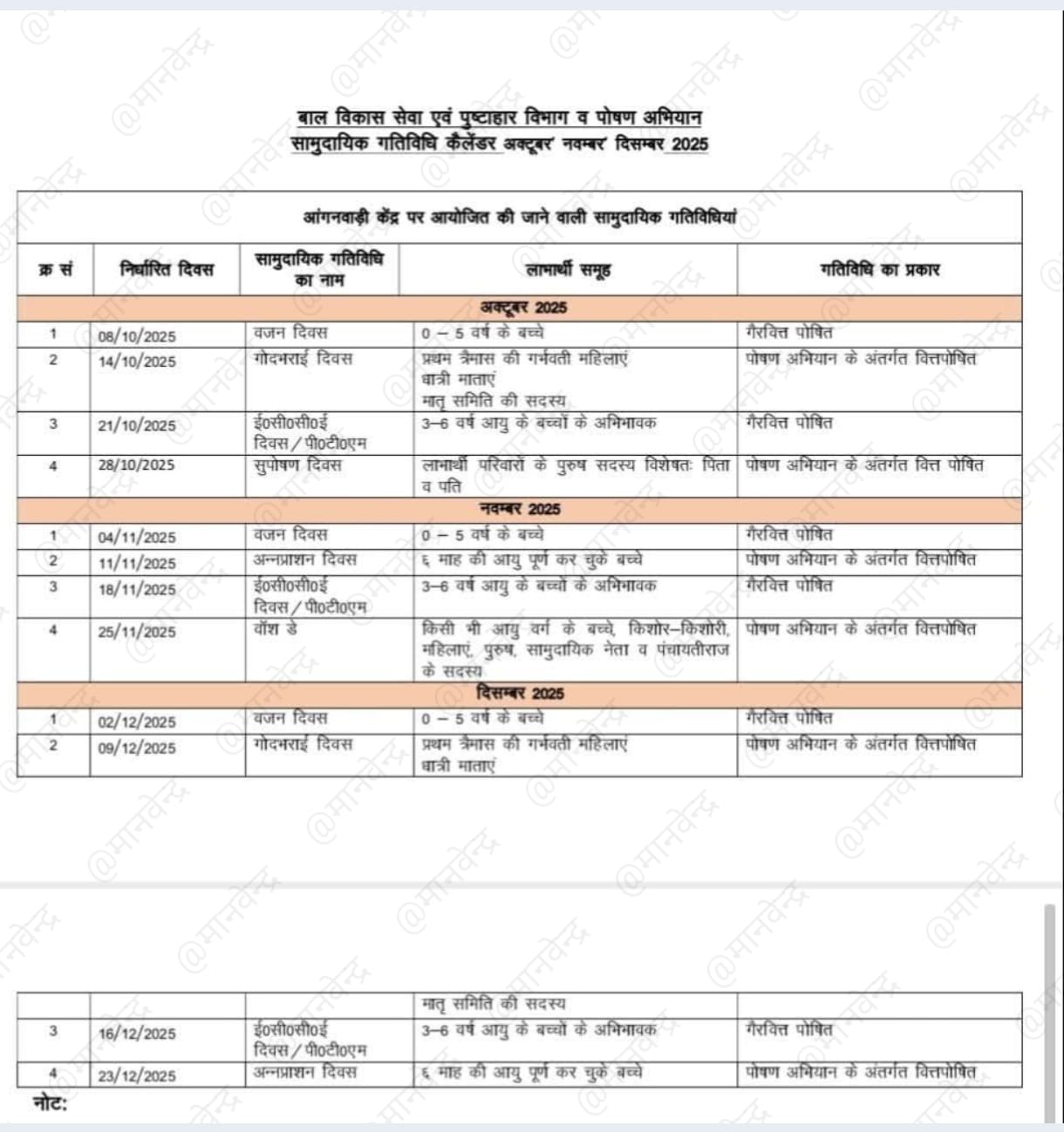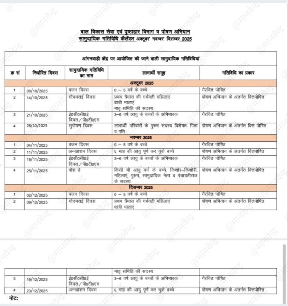 बाल विकास सेवा एवं पुष्टाहार विभागसामुदायिक गतिविधि कैलेंडर अक्टूबर-नवंबर-दिसंबर 2025