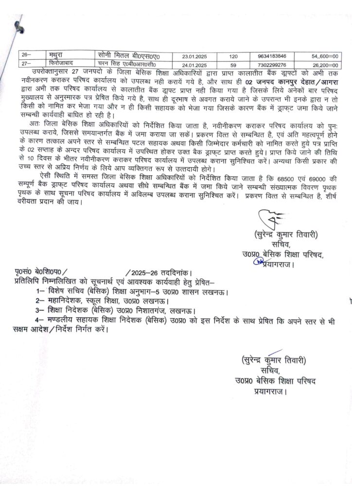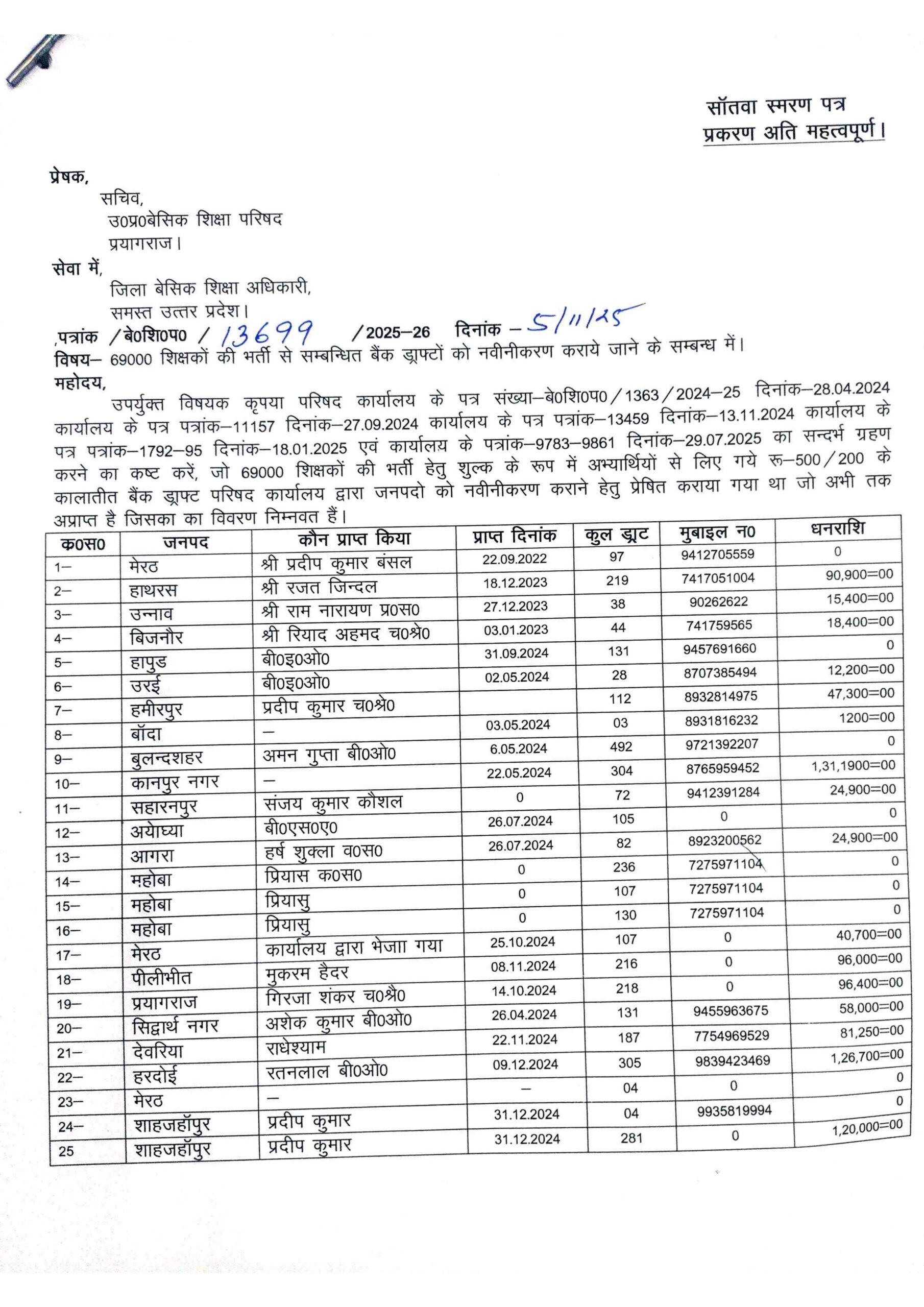 69000 शिक्षकों भर्ती से सम्बन्धित बैंक ड्राफटों को नवीनीकरण कराये जाने के सम्बन्ध में।